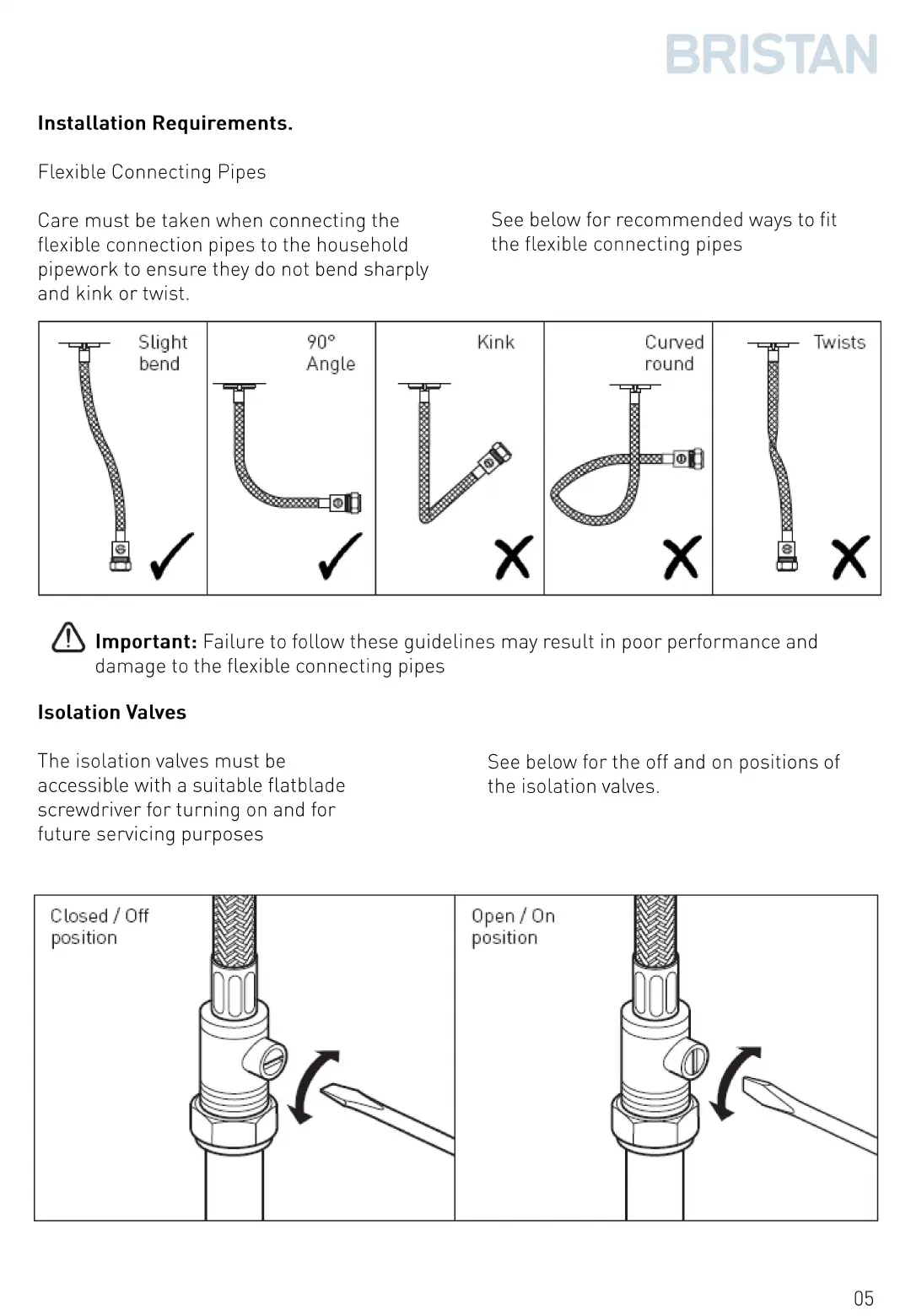 Bristan Cinnamon - Installation Requirements; Flexible Connecting Pipes; Isolation Valves