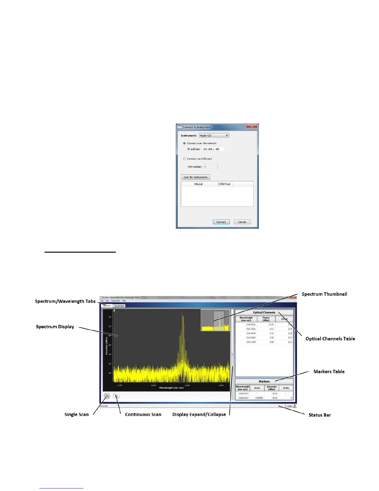 “Connect.” If the COM port is unknown, click “Scan for Instruments” to locate the