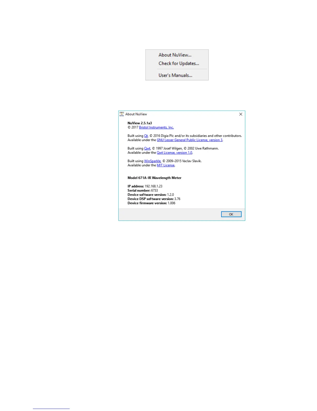• Check for Updates – Contacts the NuView software server to check for software