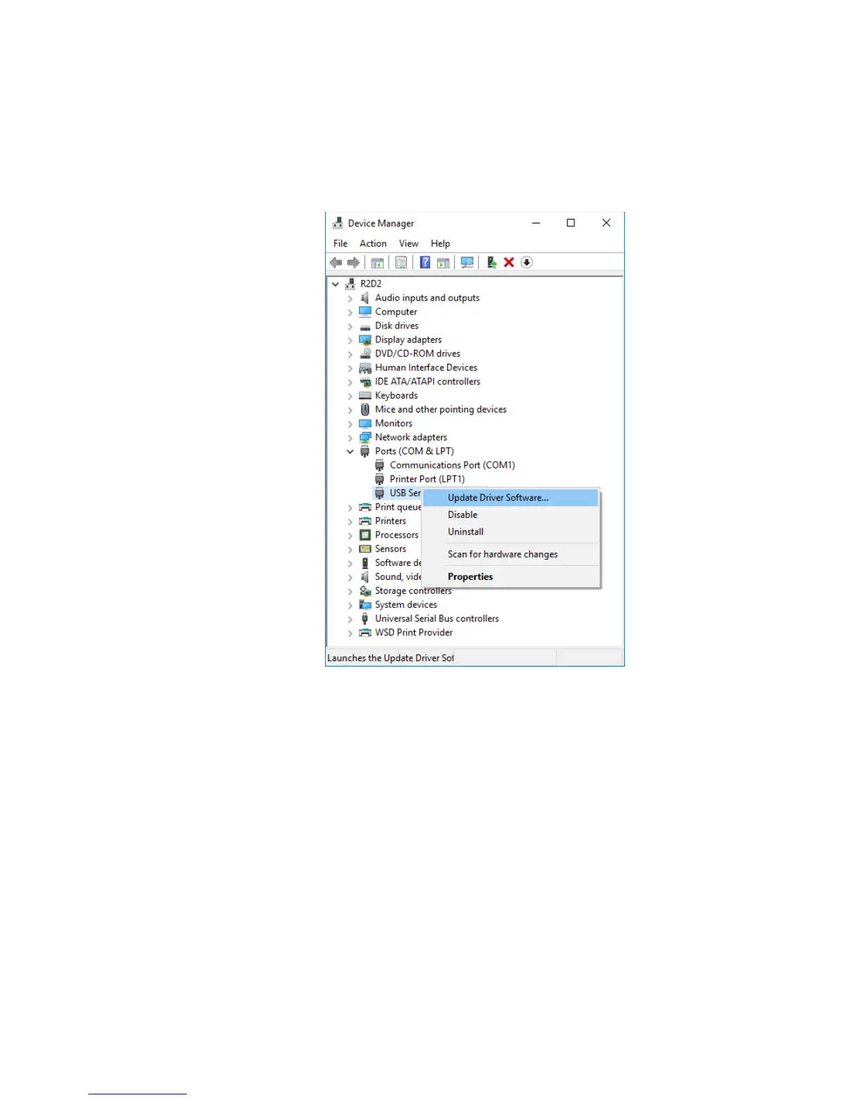 1 Right click on “USB Serial Port” and choose "Update Driver Software".