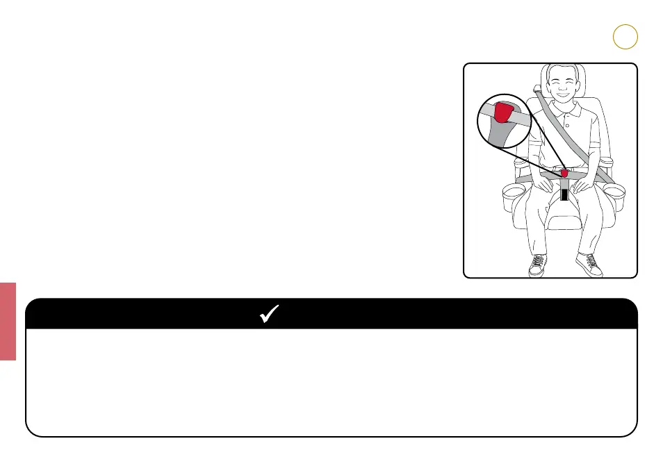 9 Shoulder belt lies across the center of the child’s chest and is positioned at or above the