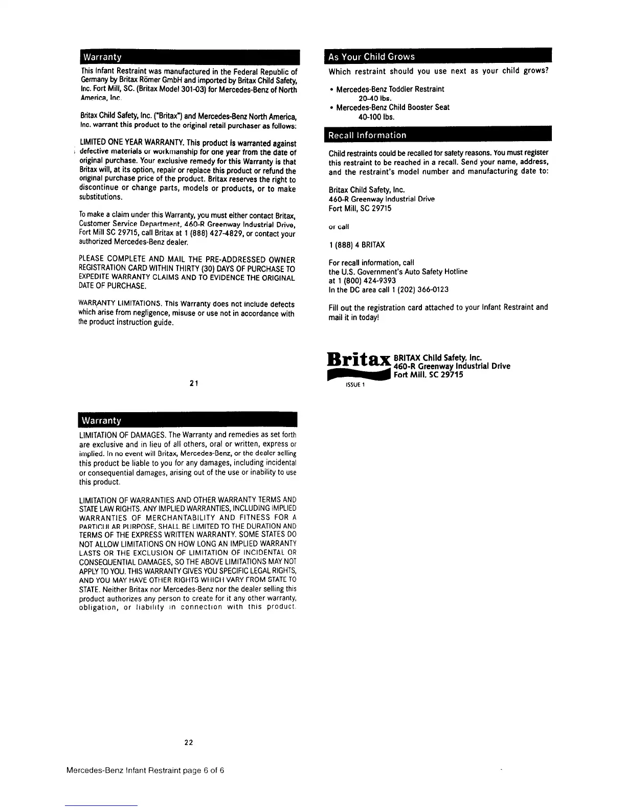 Inc. Fort Mill, SC. (Britax Model 301-03) for Mercedes-Benz of North