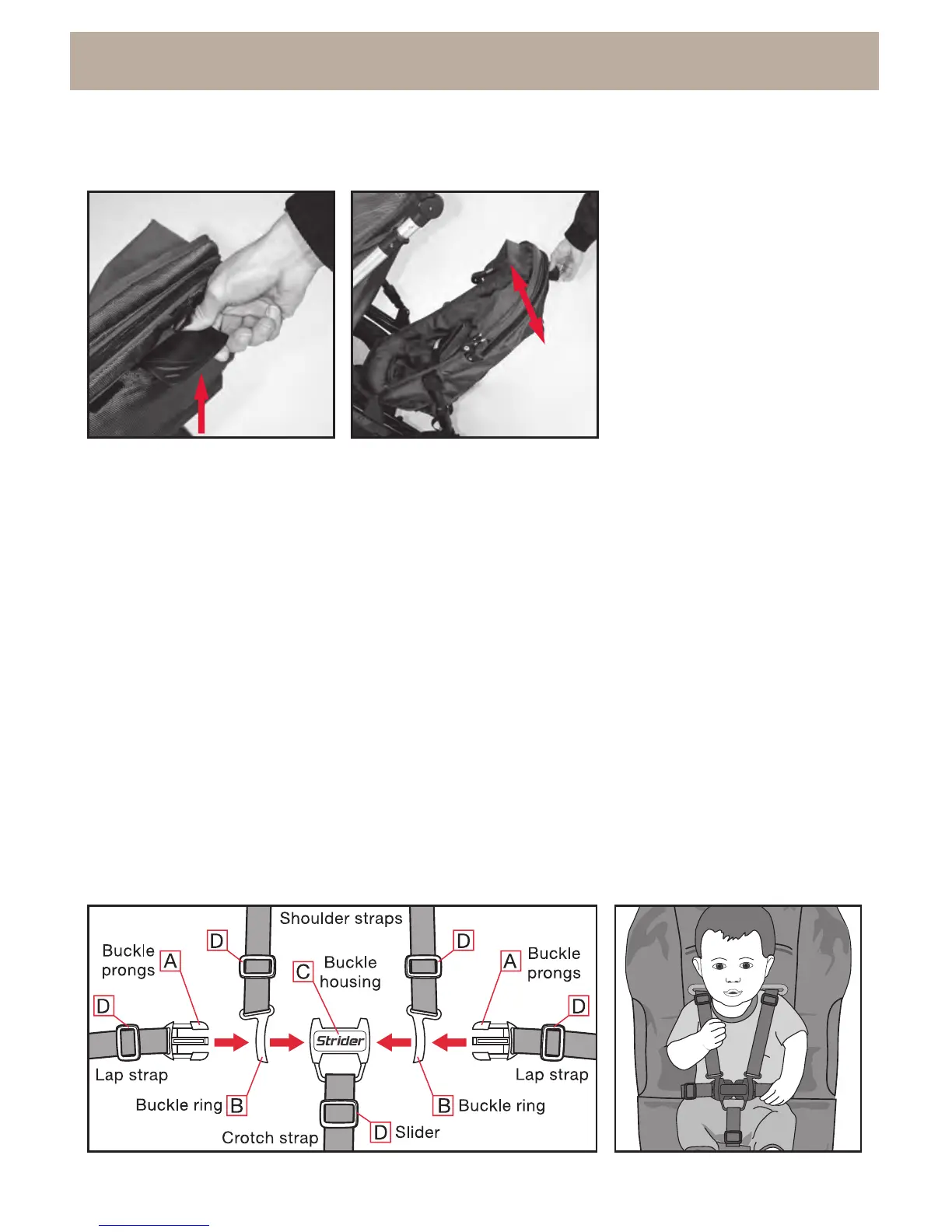 A five-point harness is provided to restrain your child. To secure the child in the harness,