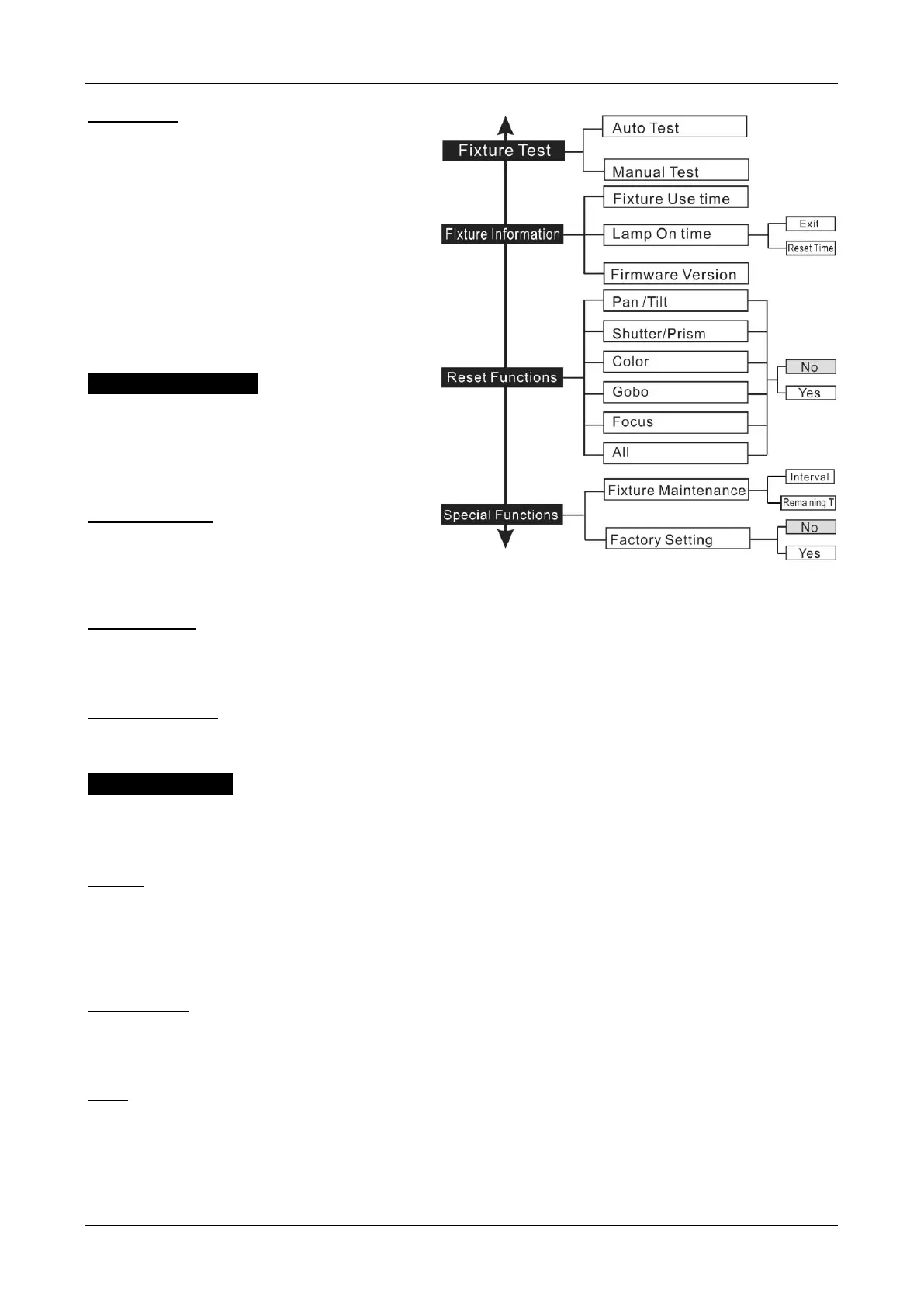 touches HAUT et BAS pour sélectionner Pan/Tilt, Shutter/Prism, Color, Gobo, Zoom/ Focus/ Frost ou