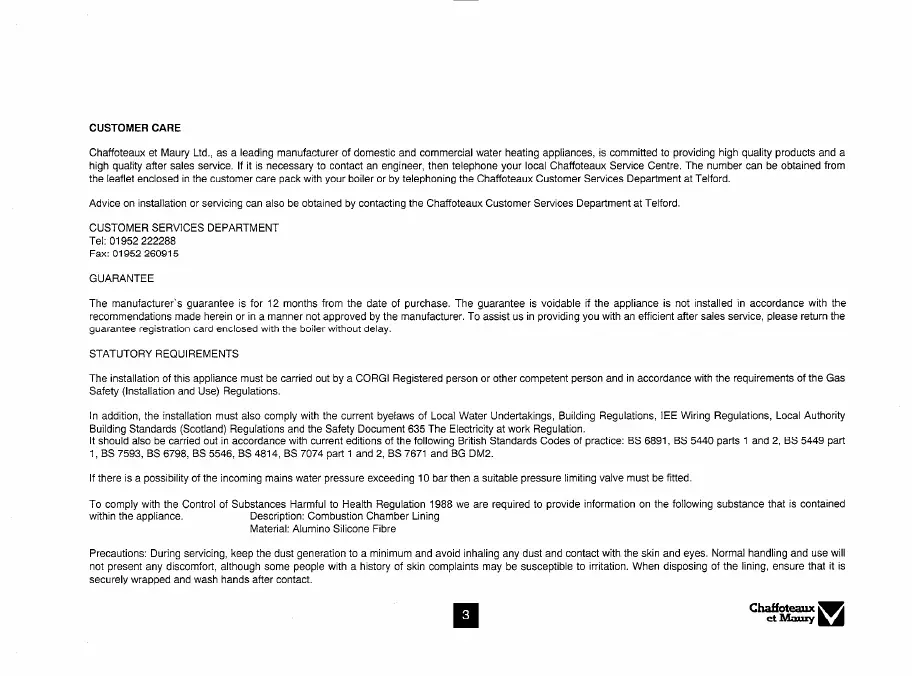 Advrce on rnstallatron or servrcrng can also be obtarned by contactrng the Chaffoteaux Customer Servrces Department at Telford.