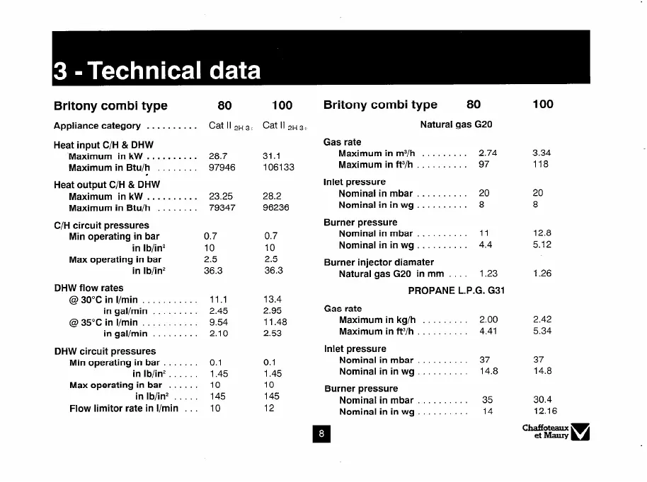 Britony Combi 80 - Technical Data; Heat Input and Output; Gas and Pressure Specifications