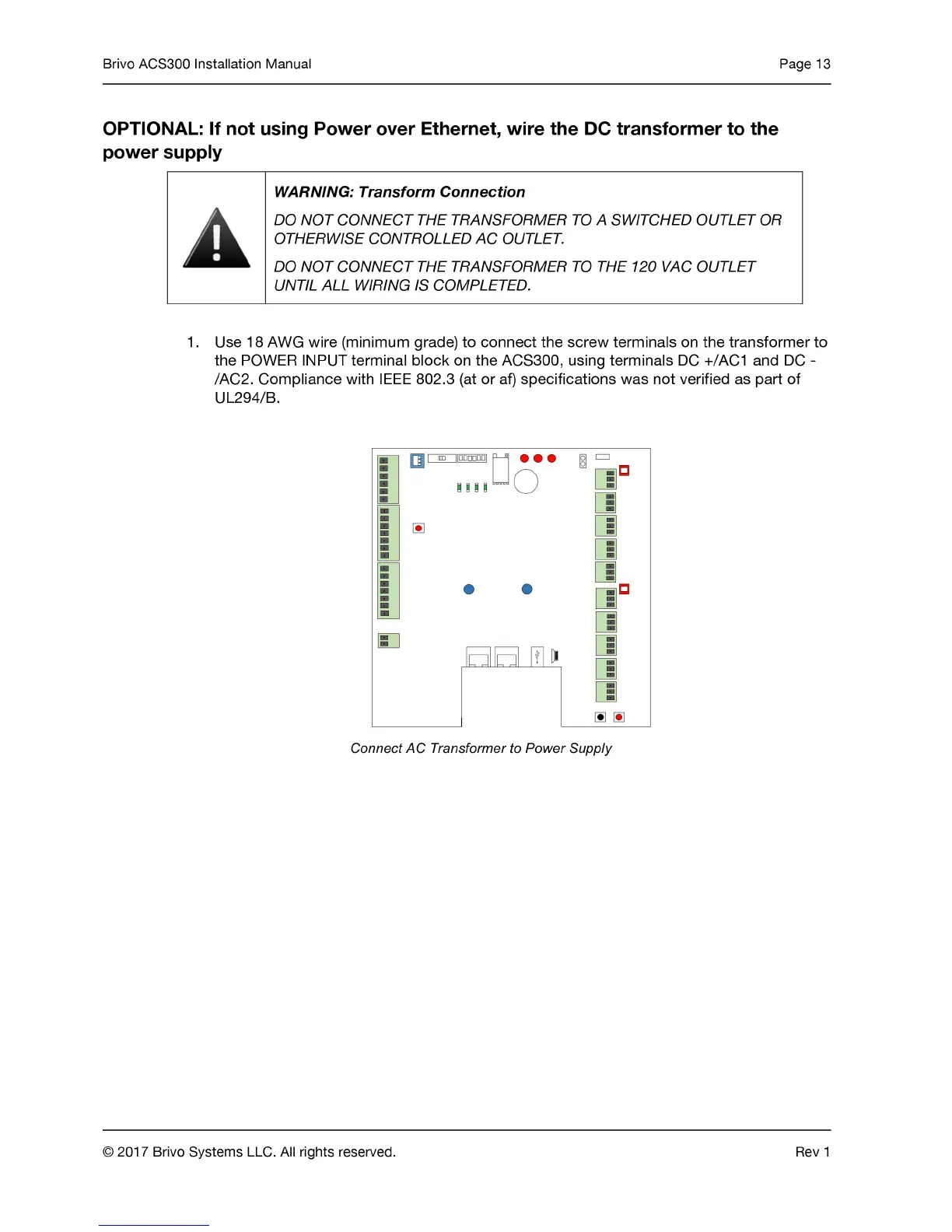 Brivo ACS300-E - Power Supply Connections; WARNING: Transformer Connection; Connecting the AC Transformer to Power Supply