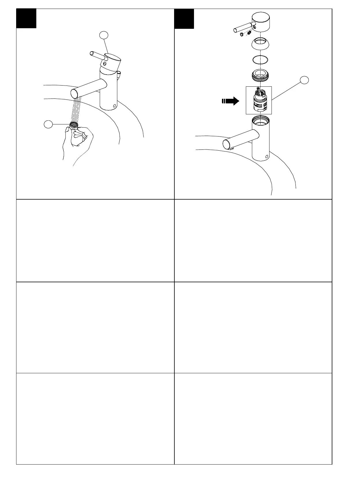 Remove aerator (1) and turn faucet handle (2) to the full on mixed
