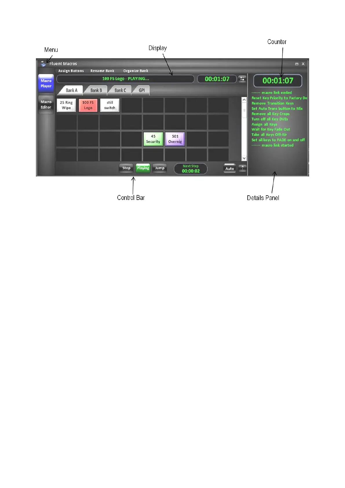 Contains 4 assignable banks of macros. Banks A, B and C can be renamed,