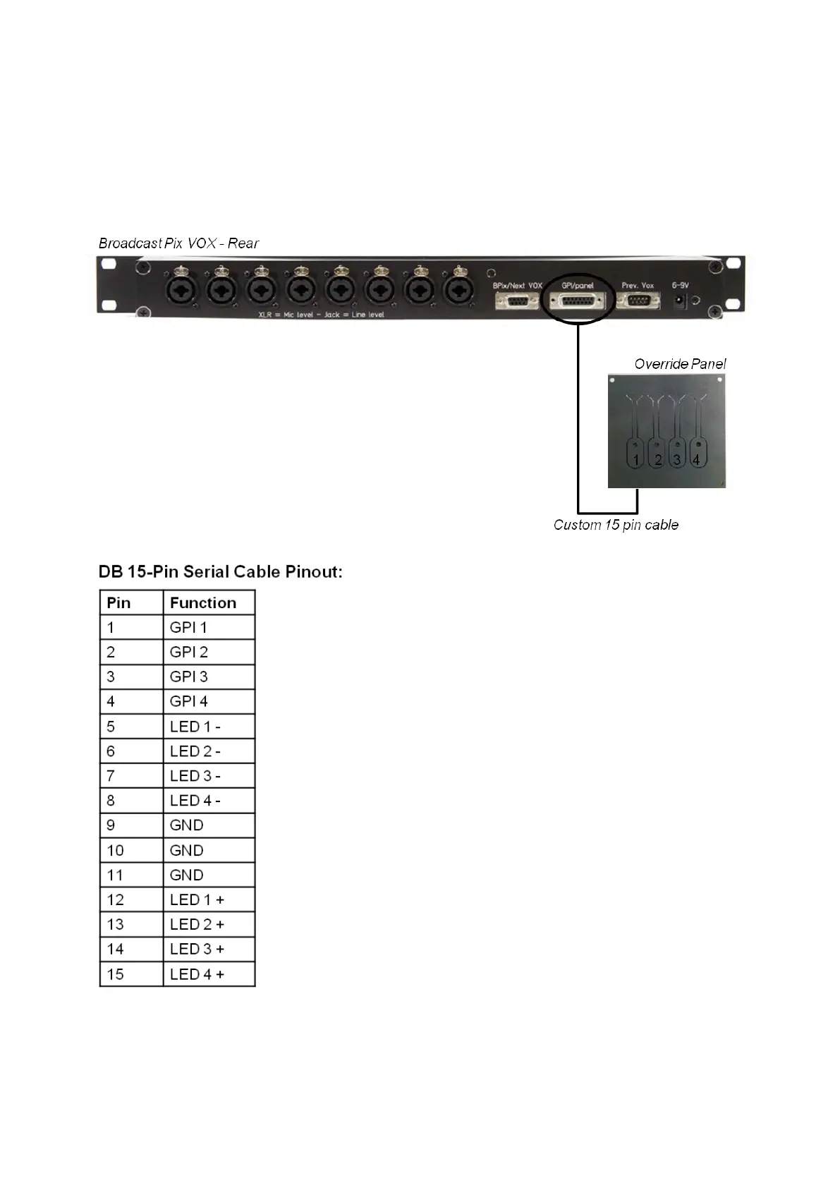 override panel which is connected to the 15 pin GPI/panel connecter on the rear