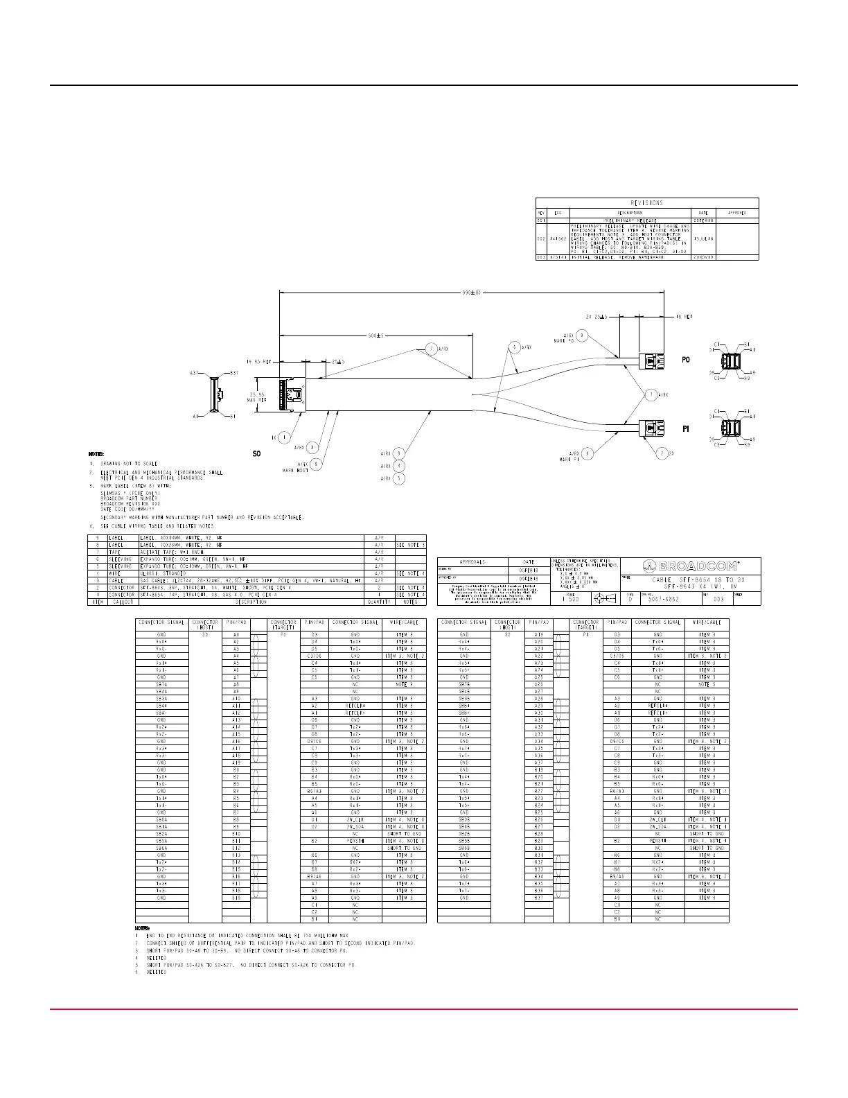 The following figure shows the drawing and pinout for Broadcom cable, 05-60002-00, a x8 SFF-8654 to 2 x4 SFF-8643