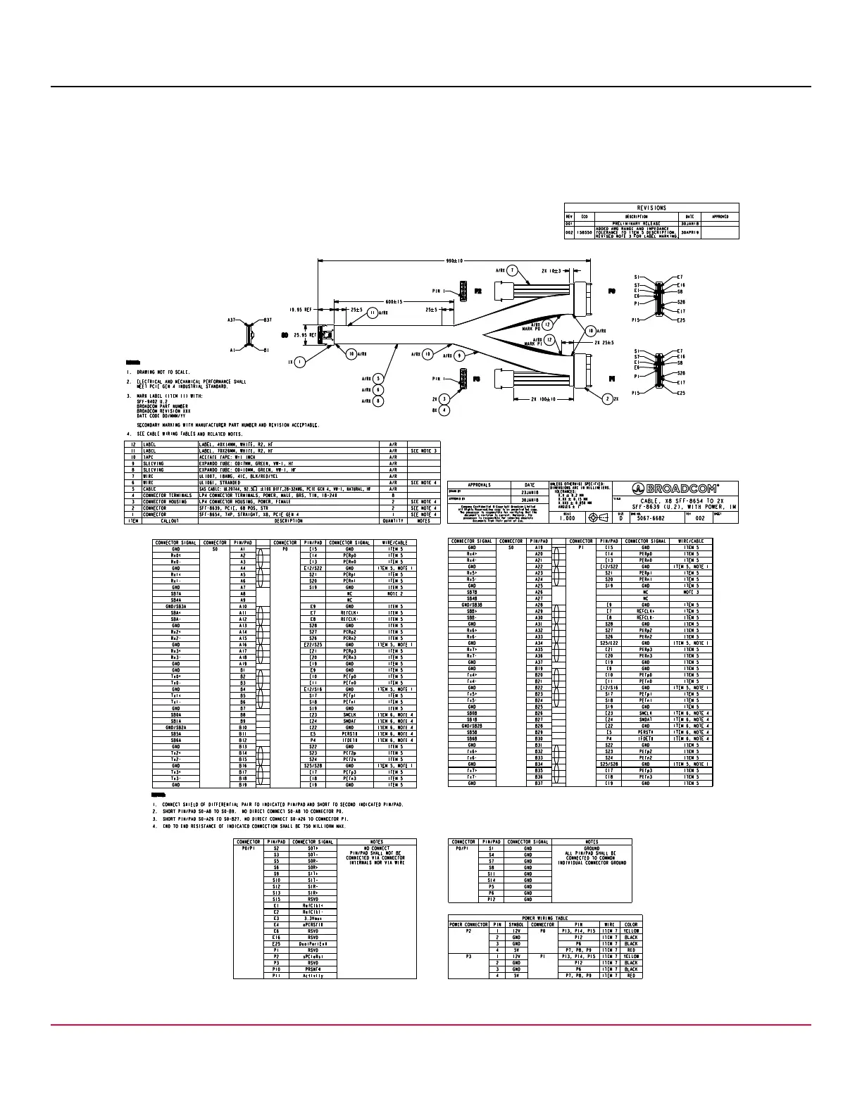 The following figure shows the drawing and pinout for Broadcom cable, 05-60005-00, a x8 SFF-8654 to 2 U.2 SFF-8639