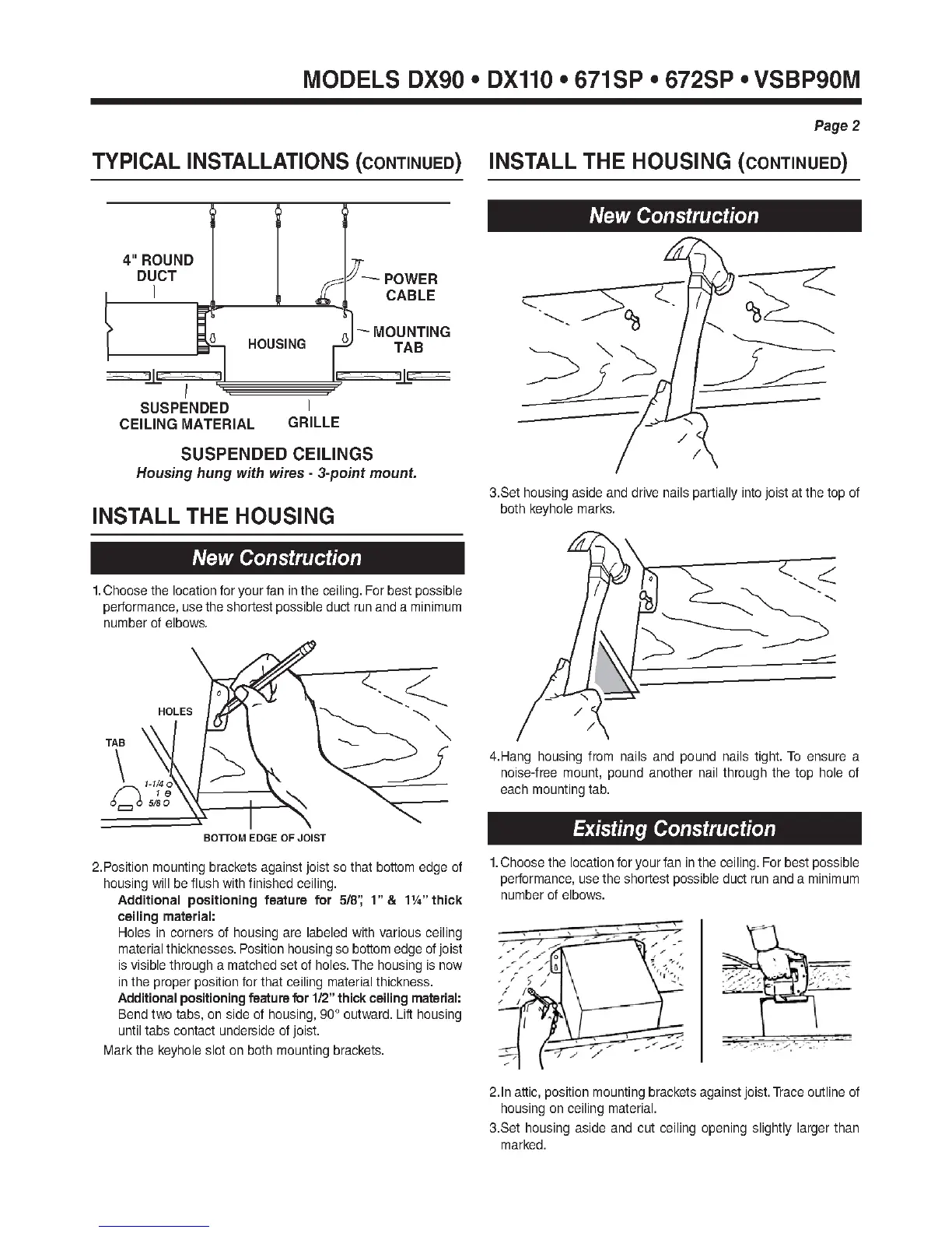 Broan DX90 - Install the Housing; New Construction Installation; Existing Construction Installation