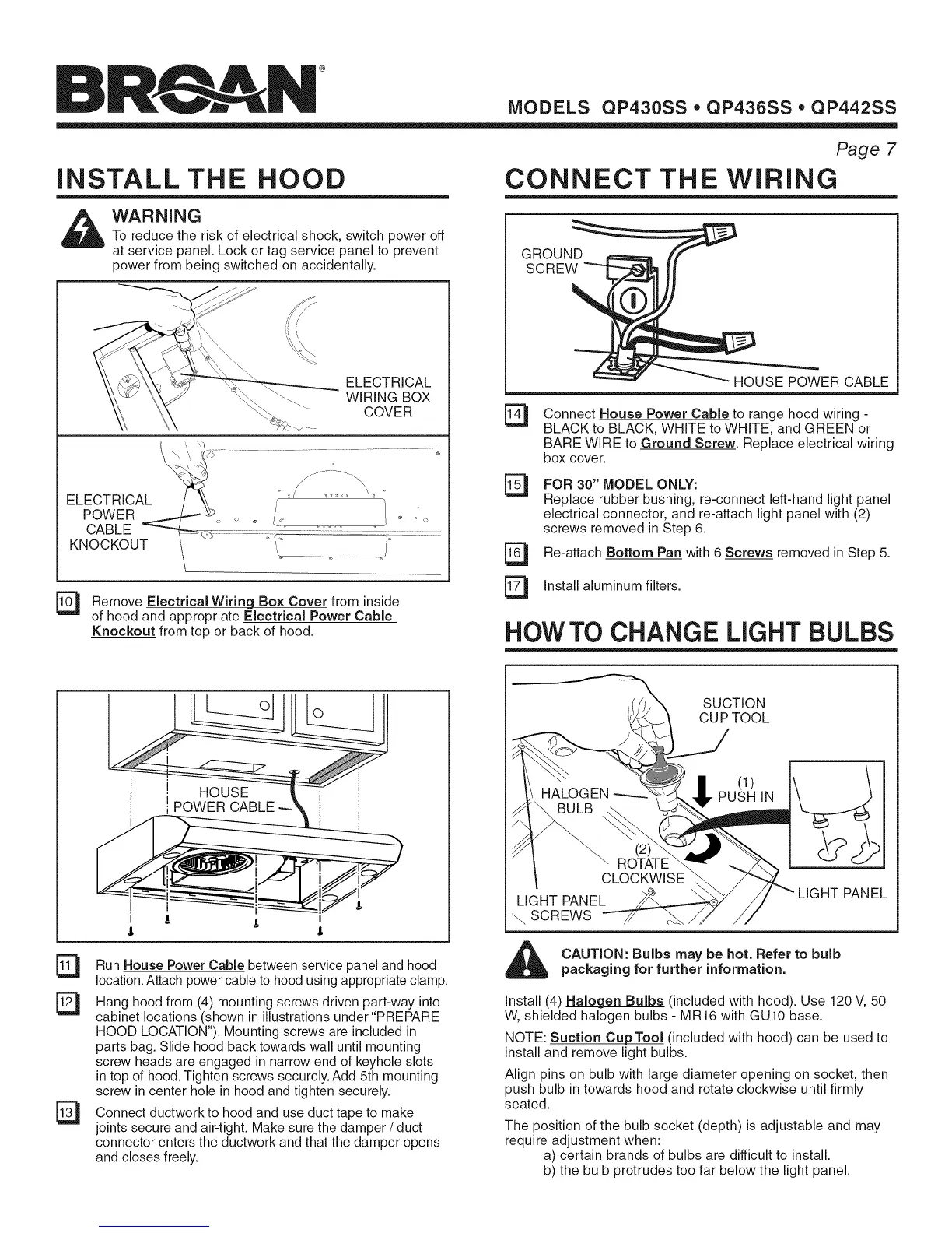 Install (4) _en Bulbs (included with hood). Use 120 V, 50