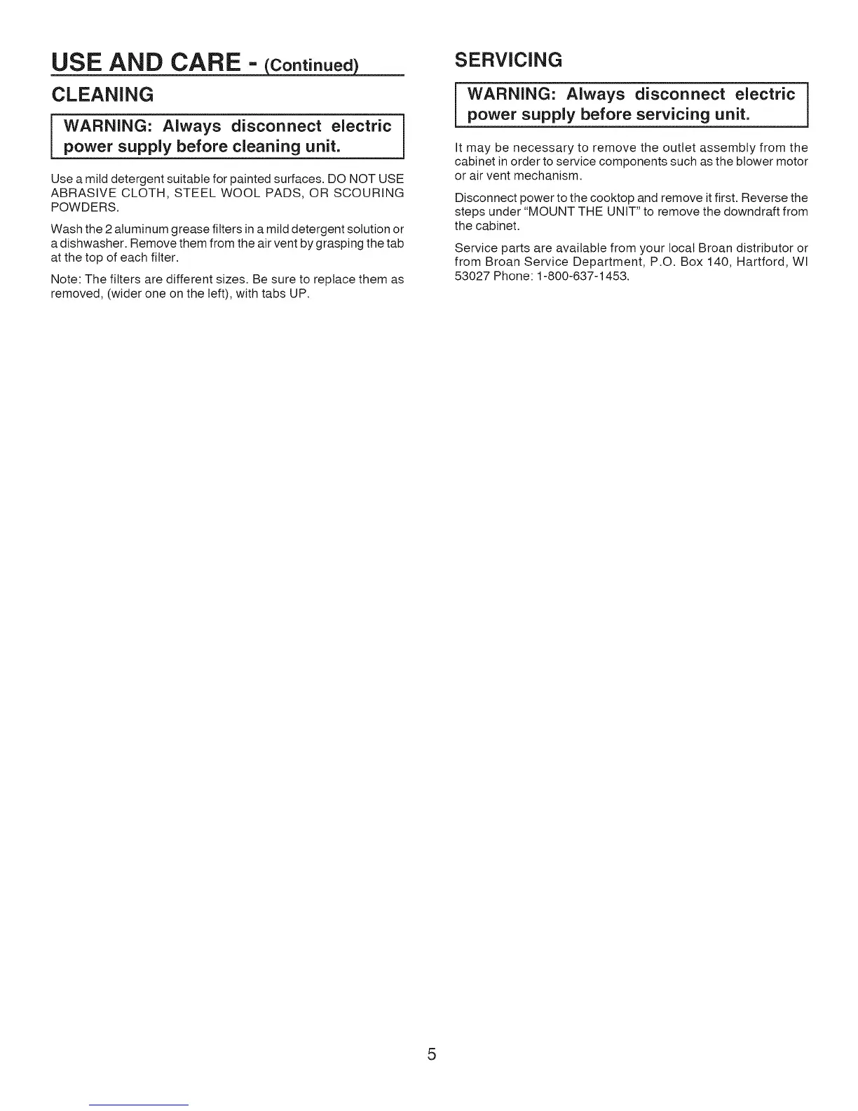 from Broan Service Department, P.O. Box 140, Hartford, WI