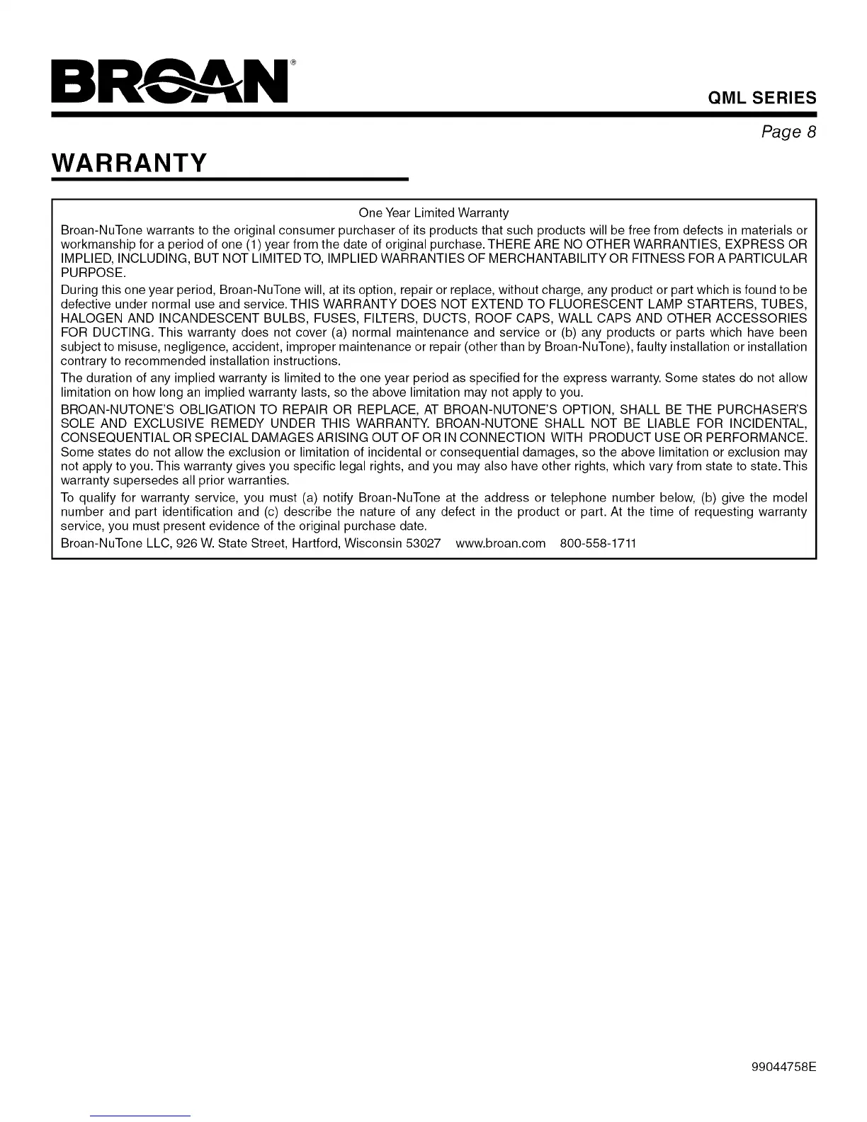 SOLE AND EXCLUSIVE REMEDY UNDER THIS WARRANTY. BROAN-NUTONE SHALL NOT BE LIABLE FOR INCIDENTAL,