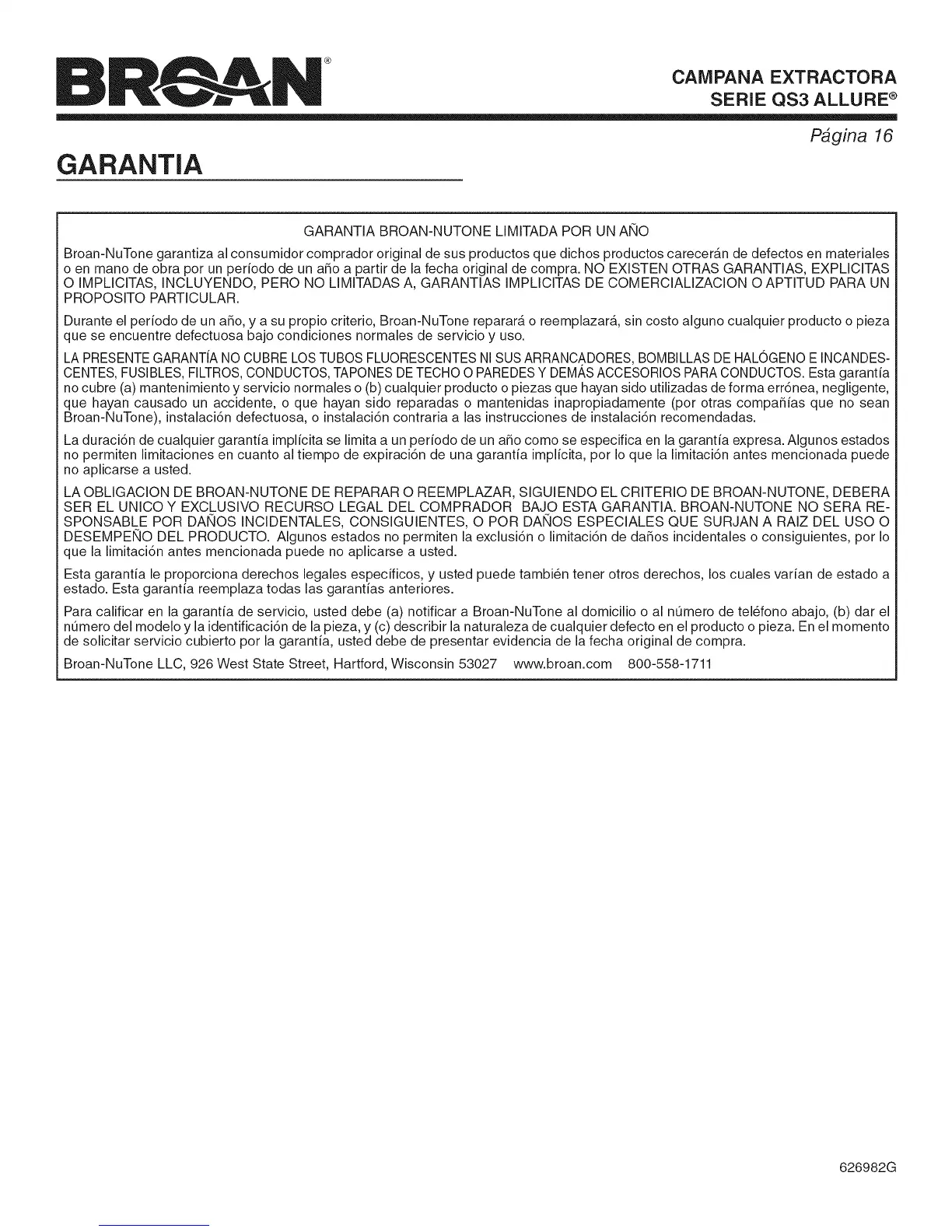 GARANTIA BROAN-NUTONE LIMITADA POR UN ANO
