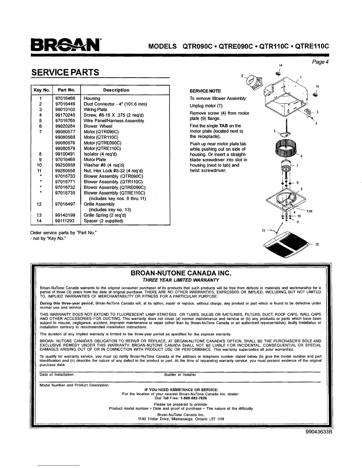 qualify for warranty service. you must (a) notify Broan-NuTone Canada at the address or telephone number stated below (b) give the model number