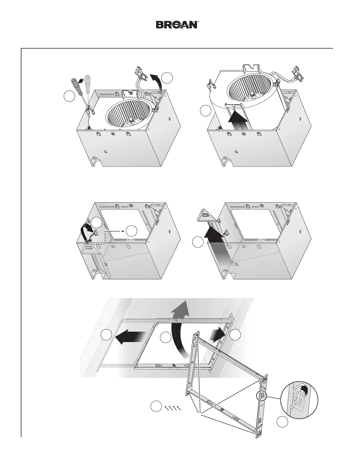 Broan XB80 - Step 5: Remove Blower Assembly; Step 6: Remove Wiring Panel; Step 7: Insert Mounting Frame