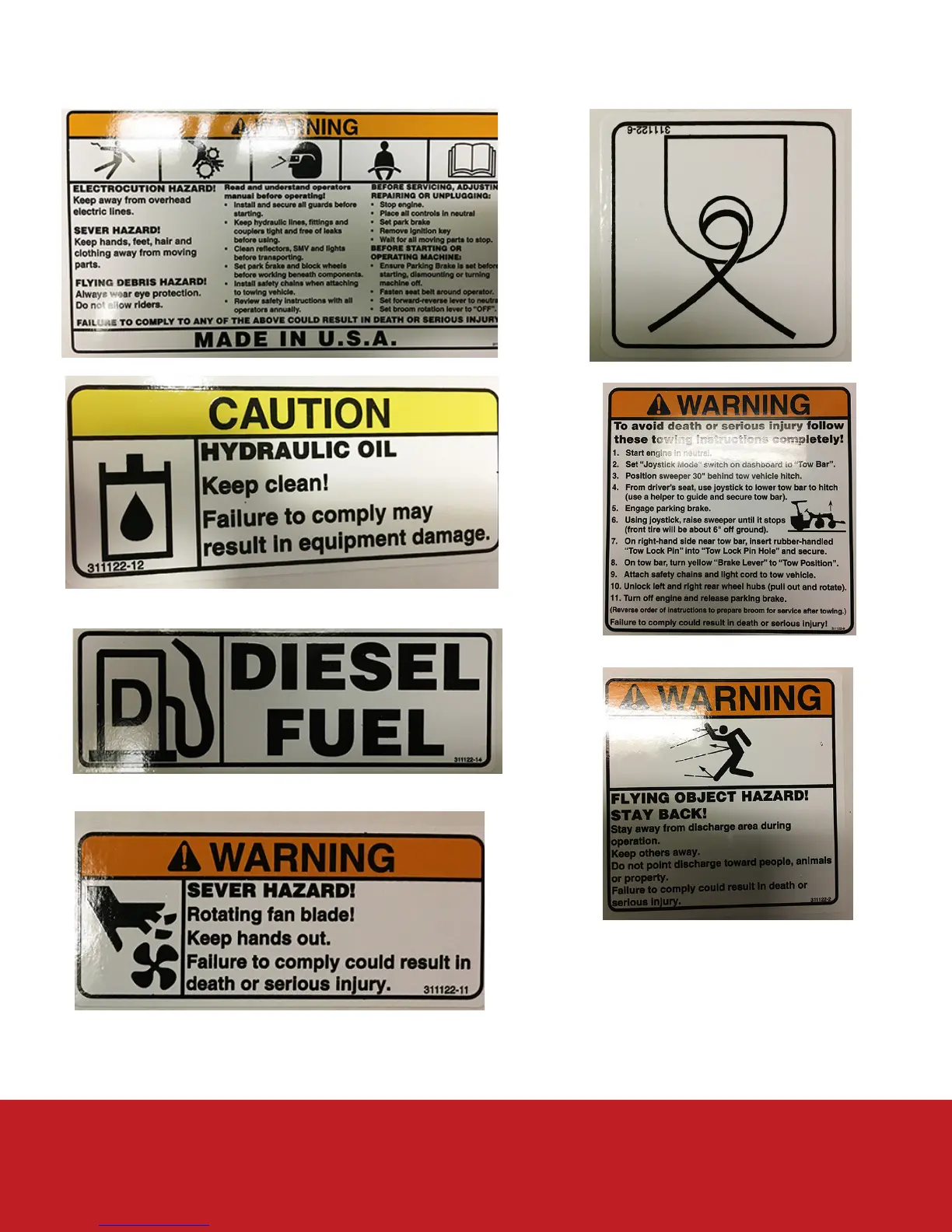 Broce BW-260 - OPERATIONS & SAFETY DECALS; HAZARD WARNINGS; CAUTION DECALS; TOWING INSTRUCTIONS DECAL