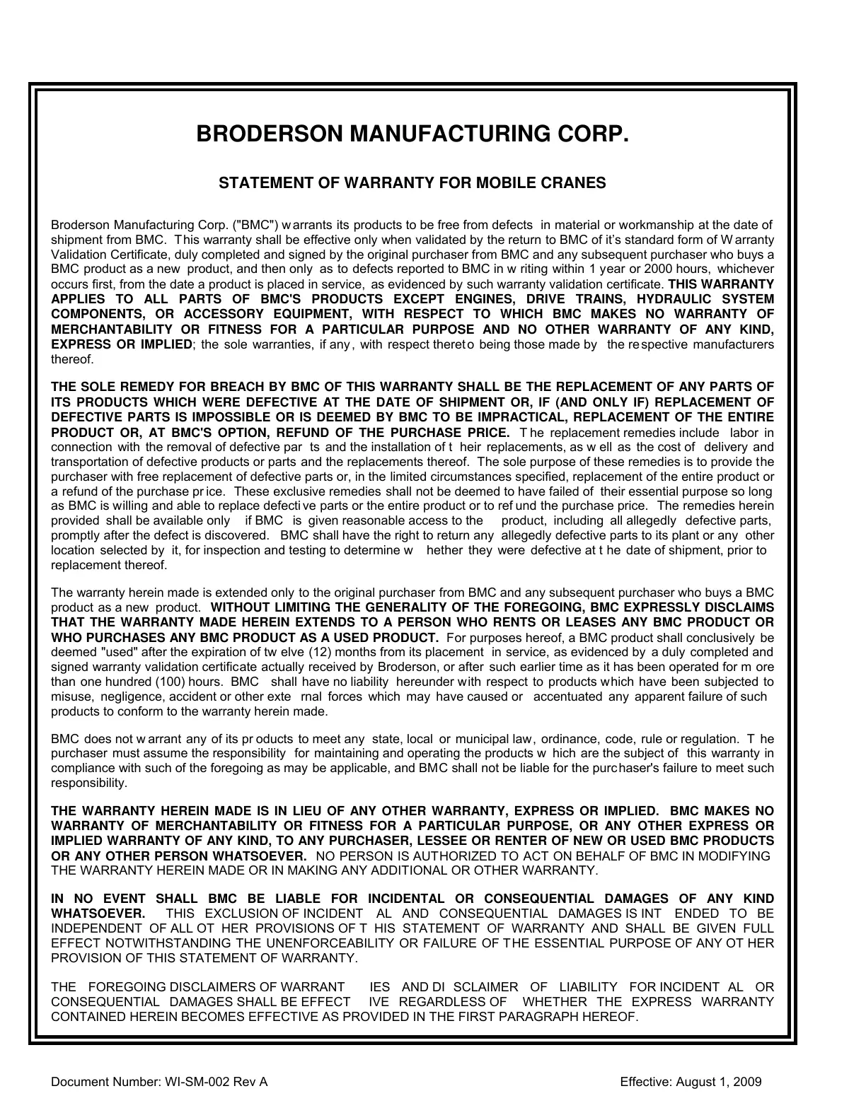 STATEMENT OF WARRANTY FOR MOBILE CRANES