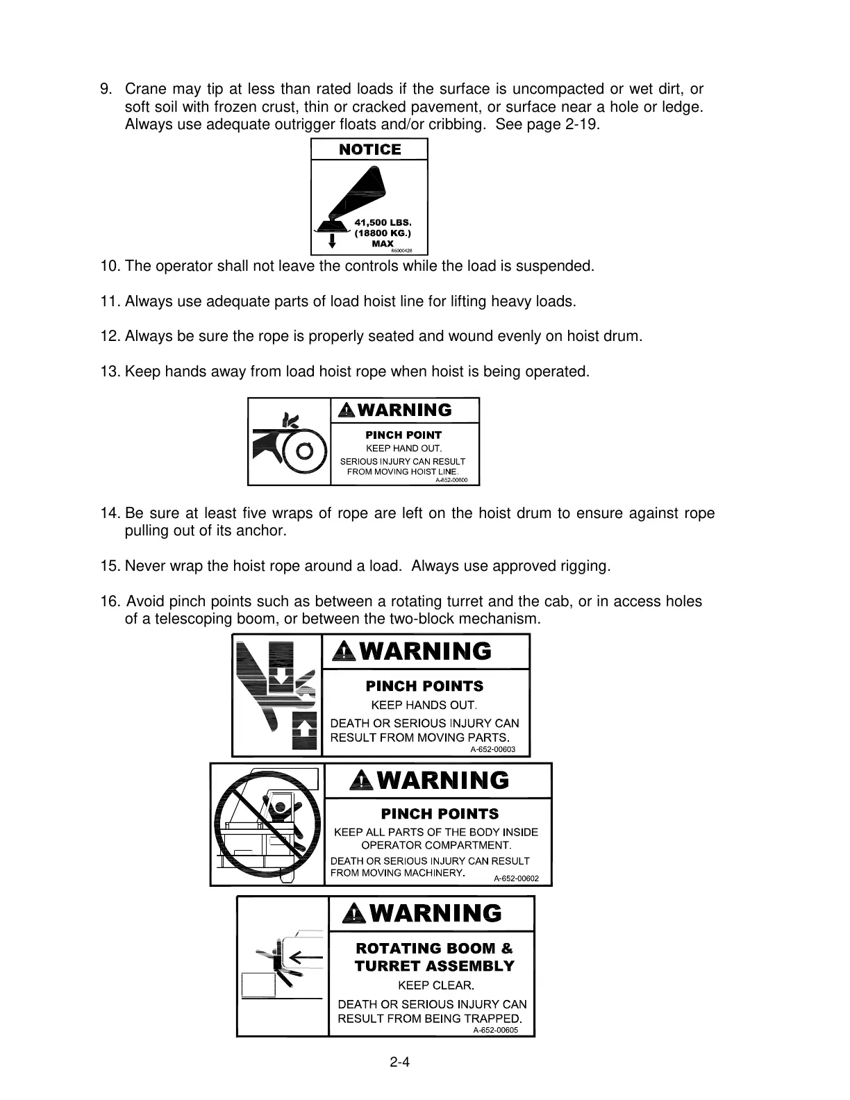 16. Avoid pinch points such as between a rotating turret and the cab, or in access holes