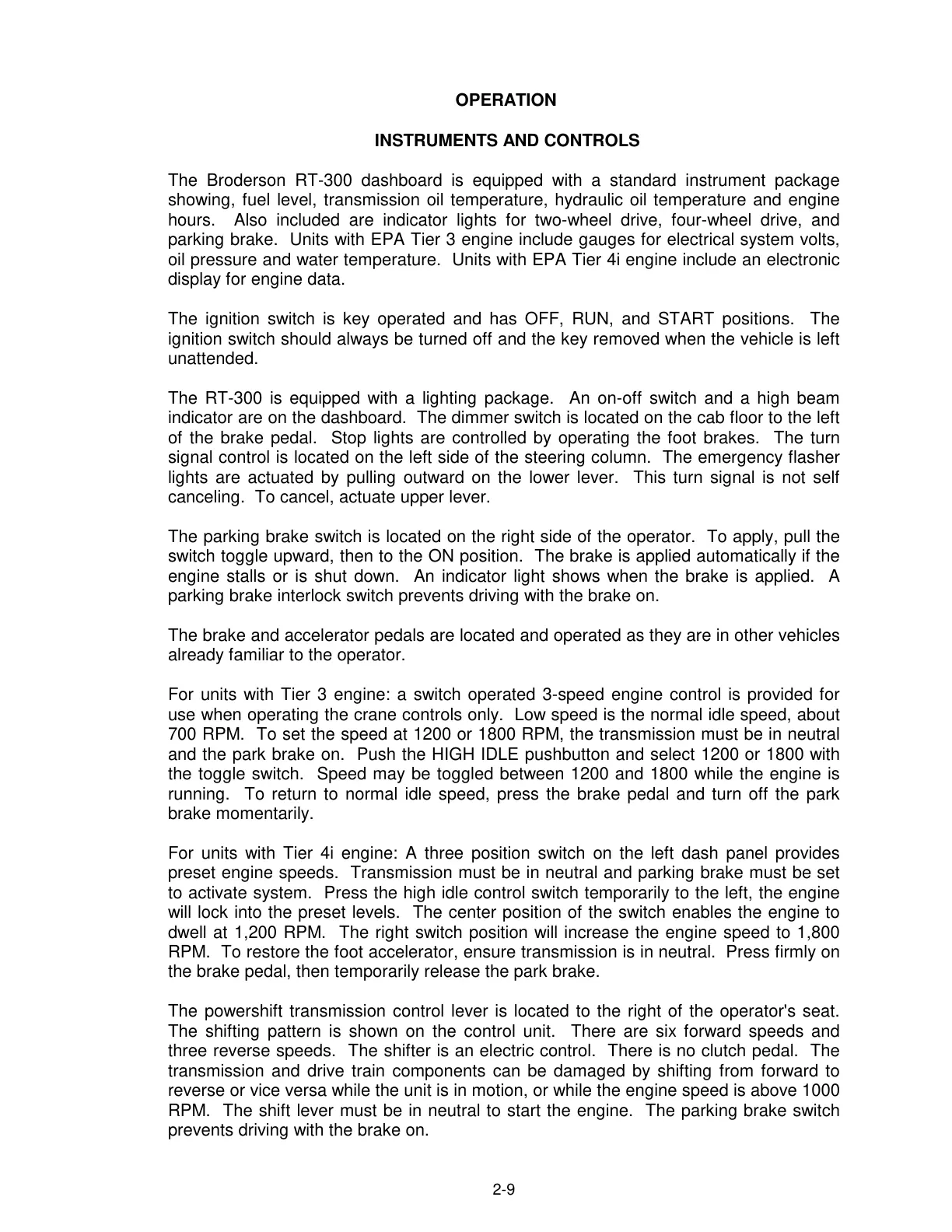 The Broderson RT-300 dashboard is equipped with a standard instrument package