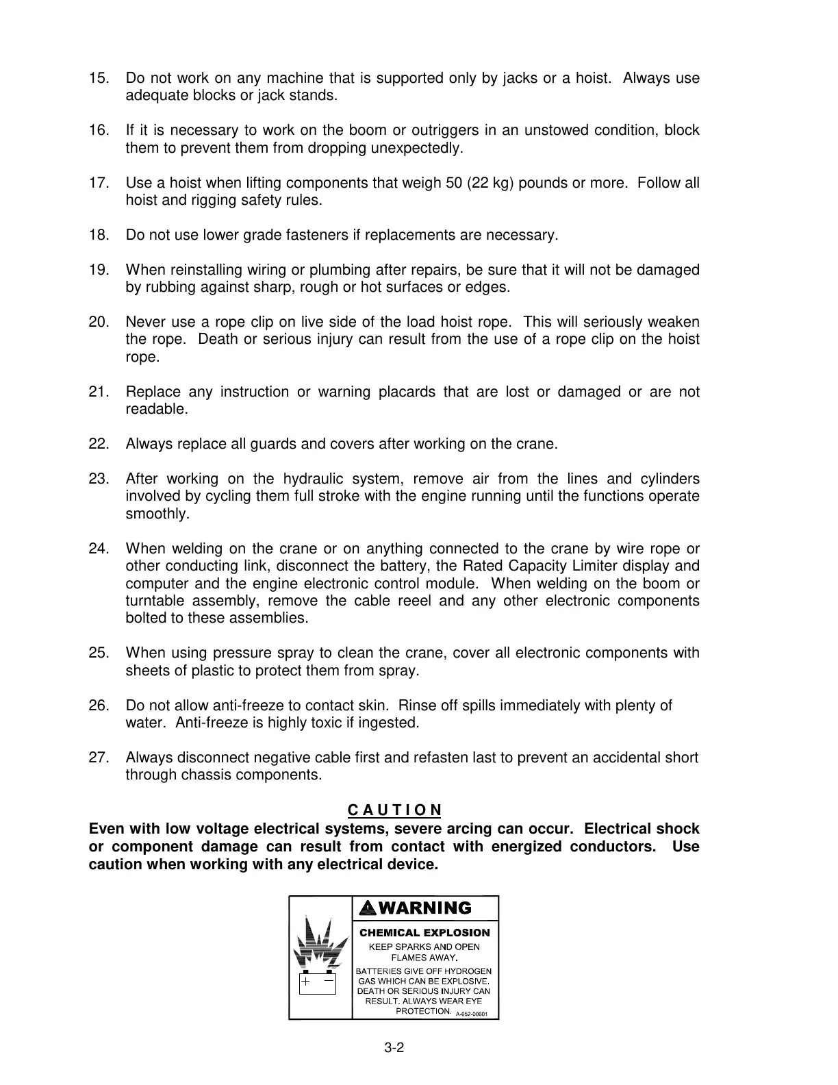 24. When welding on the crane or on anything connected to the crane by wire rope or