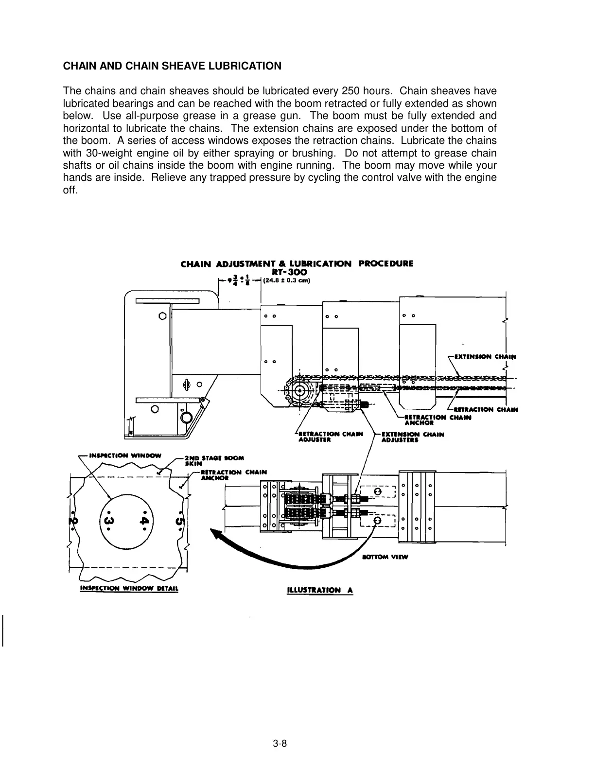 the boom. A series of access windows exposes the retraction chains. Lubricate the chains