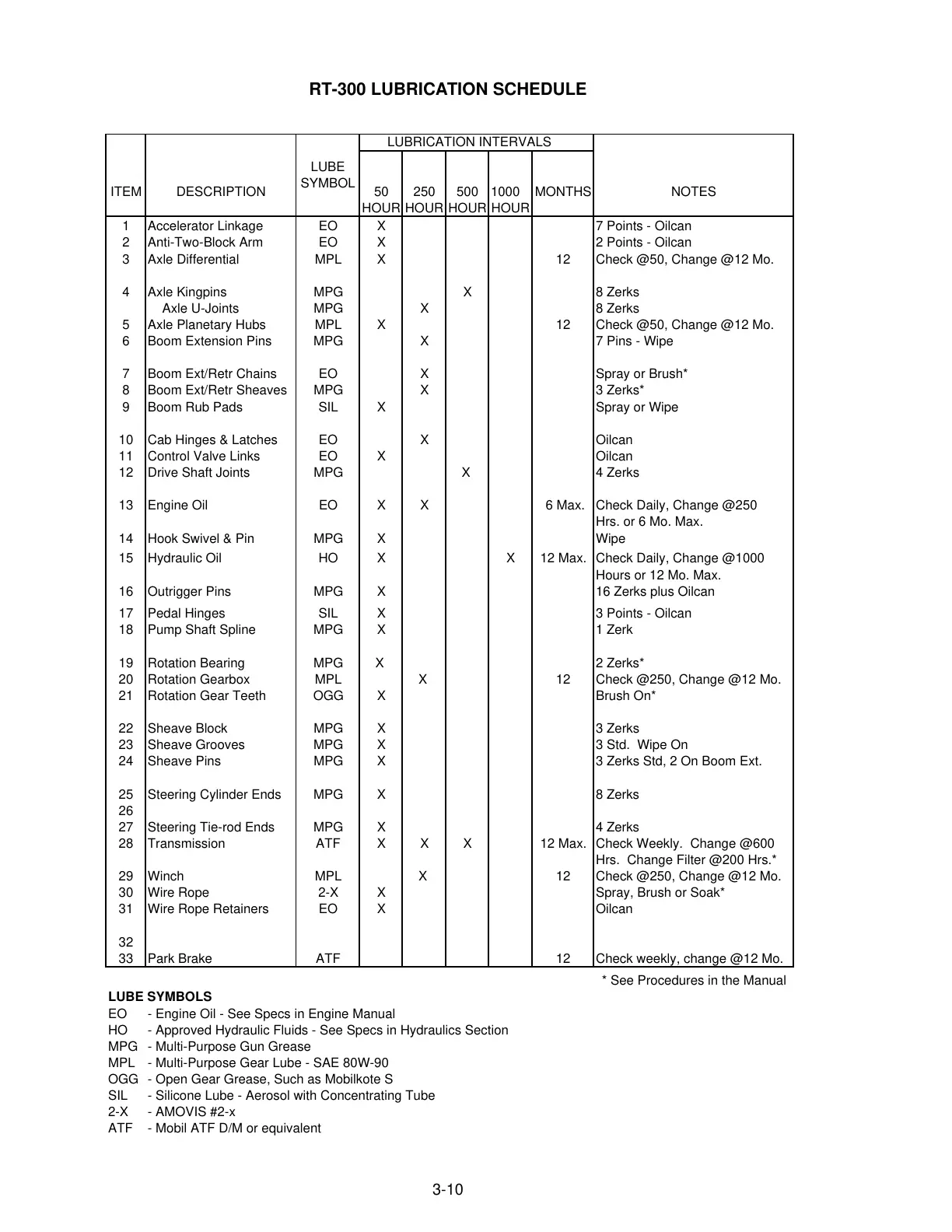 RT-300 LUBRICATION SCHEDULE