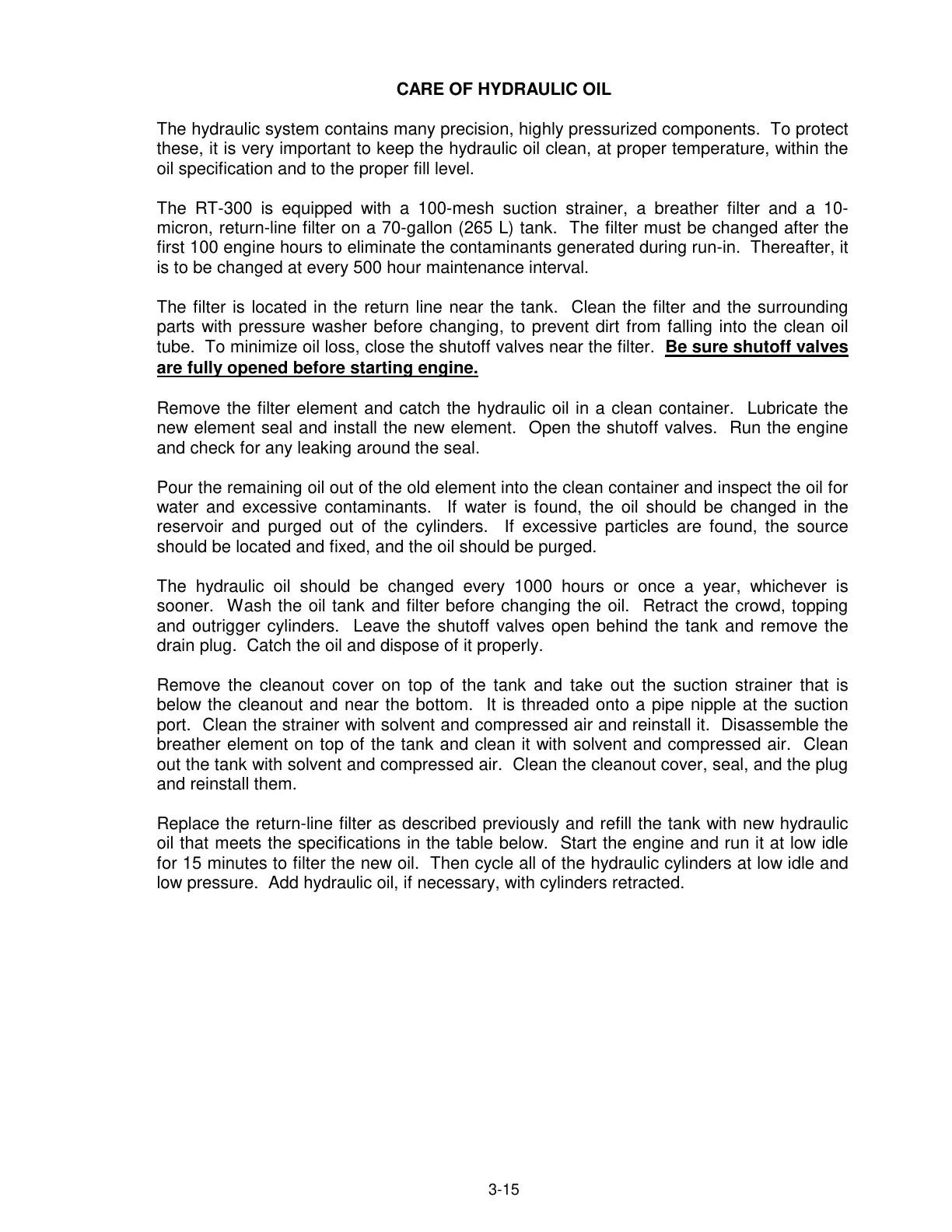 for 15 minutes to filter the new oil. Then cycle all of the hydraulic cylinders at low idle and