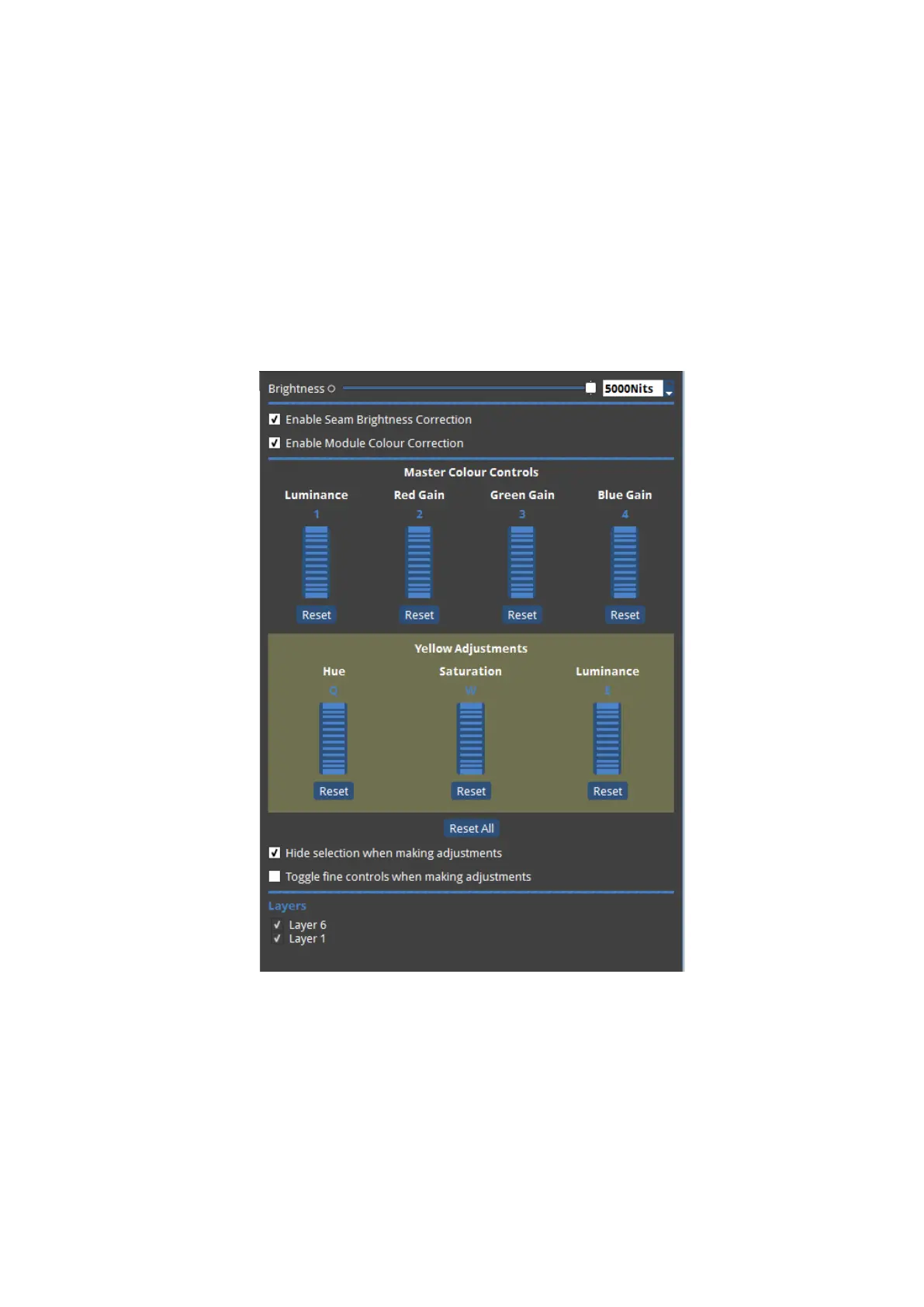 Selecting White from Display Colours allows Luminance, Red, Green and Blue Gain to be