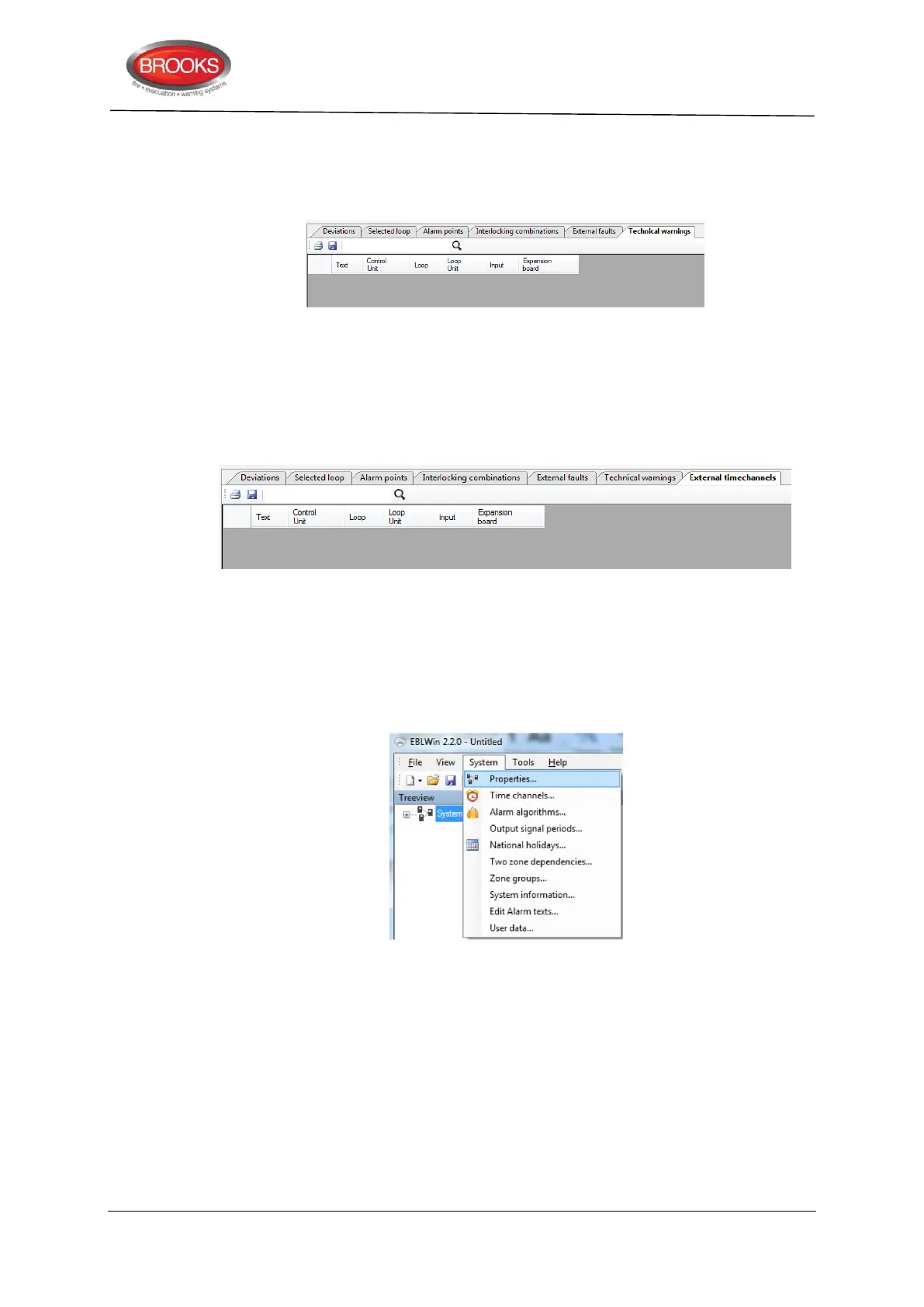 This is a list, for the whole system, showing all technical warnings and their properties.