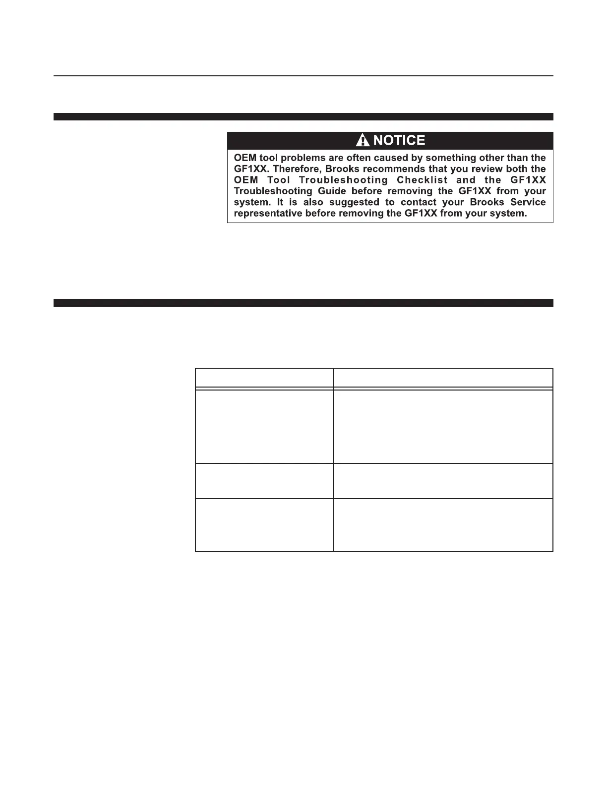 GF1XX Troubleshooting Guide that identifies symptoms, possible causes,
