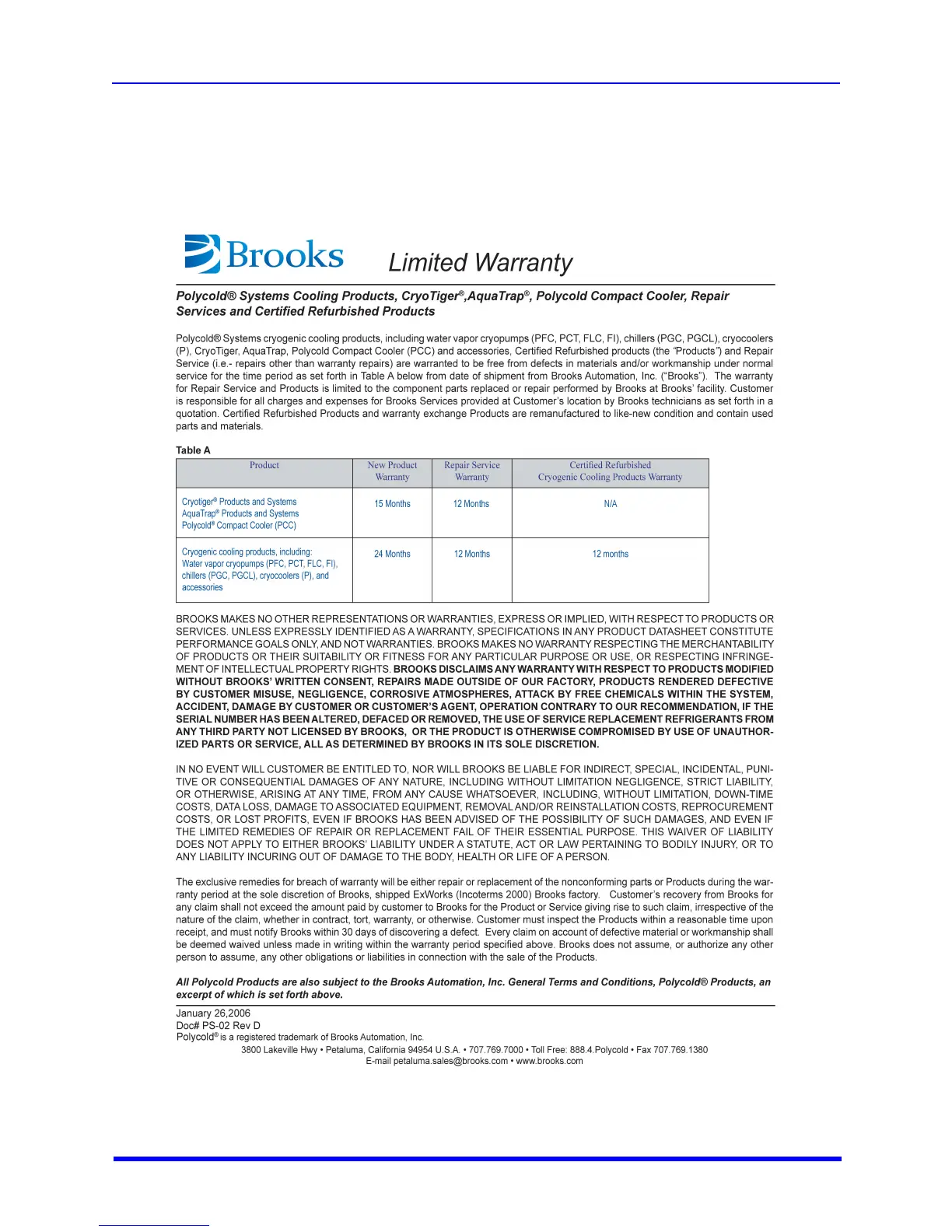 Brooks Polycold P-102 - Limited Warranty