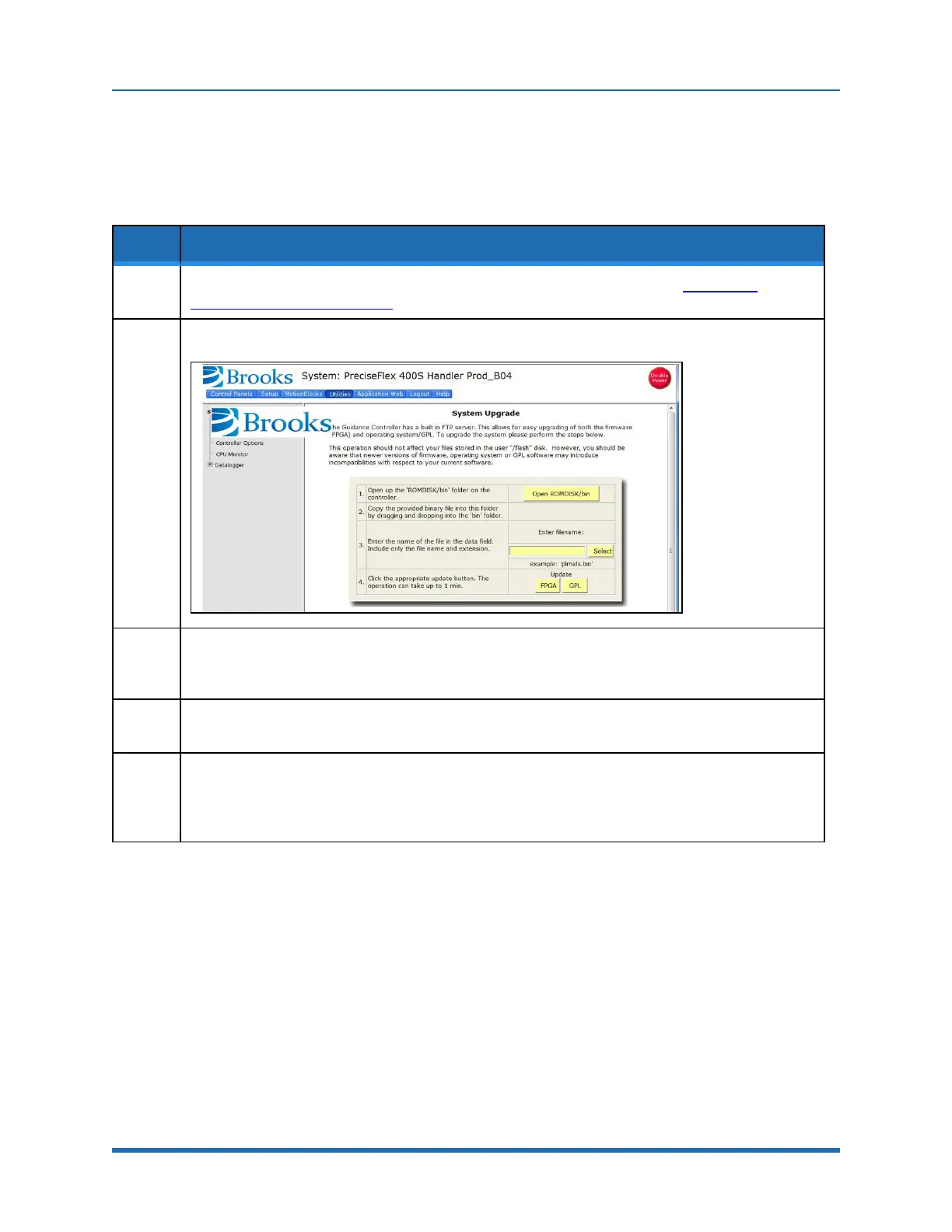 Get the appropriate upgrade software from Brooks in the form of a .bin file. Email support_pre-