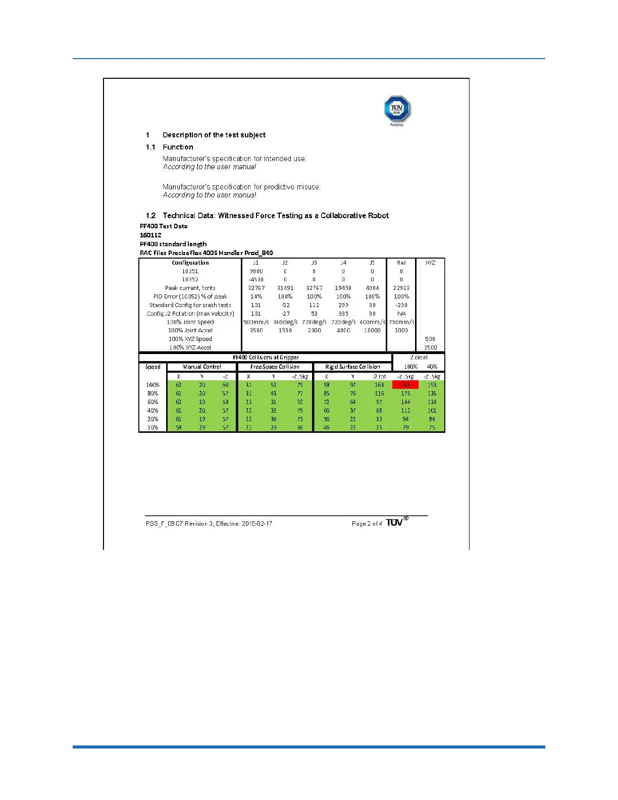 Part Number: PF40-DI-00010 Rev. A Appendix G: TUV Verification of PF400 Collision Forces