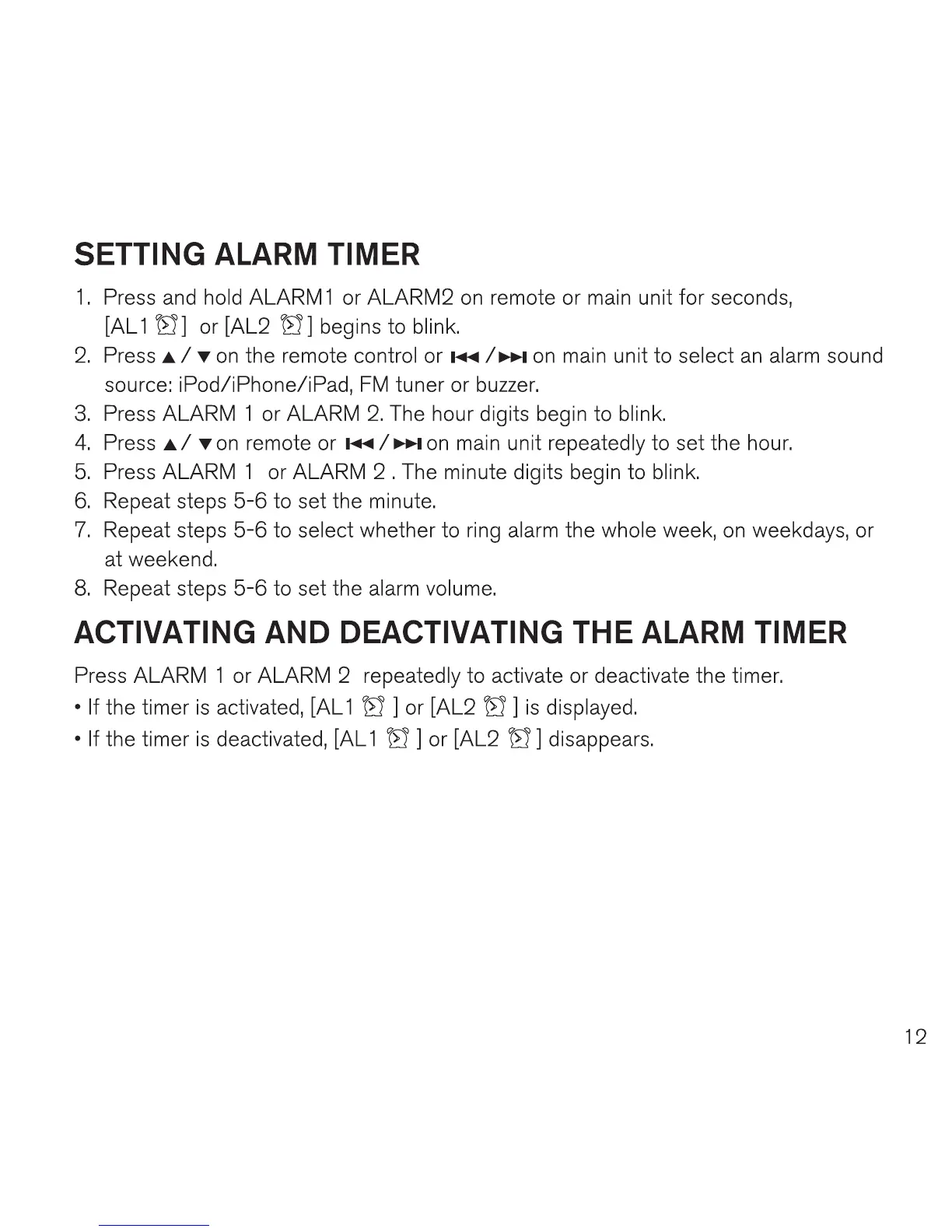 Brookstone Bluetooth Clock Radio - Setting Alarm Timer; Activating and Deactivating the Alarm Timer