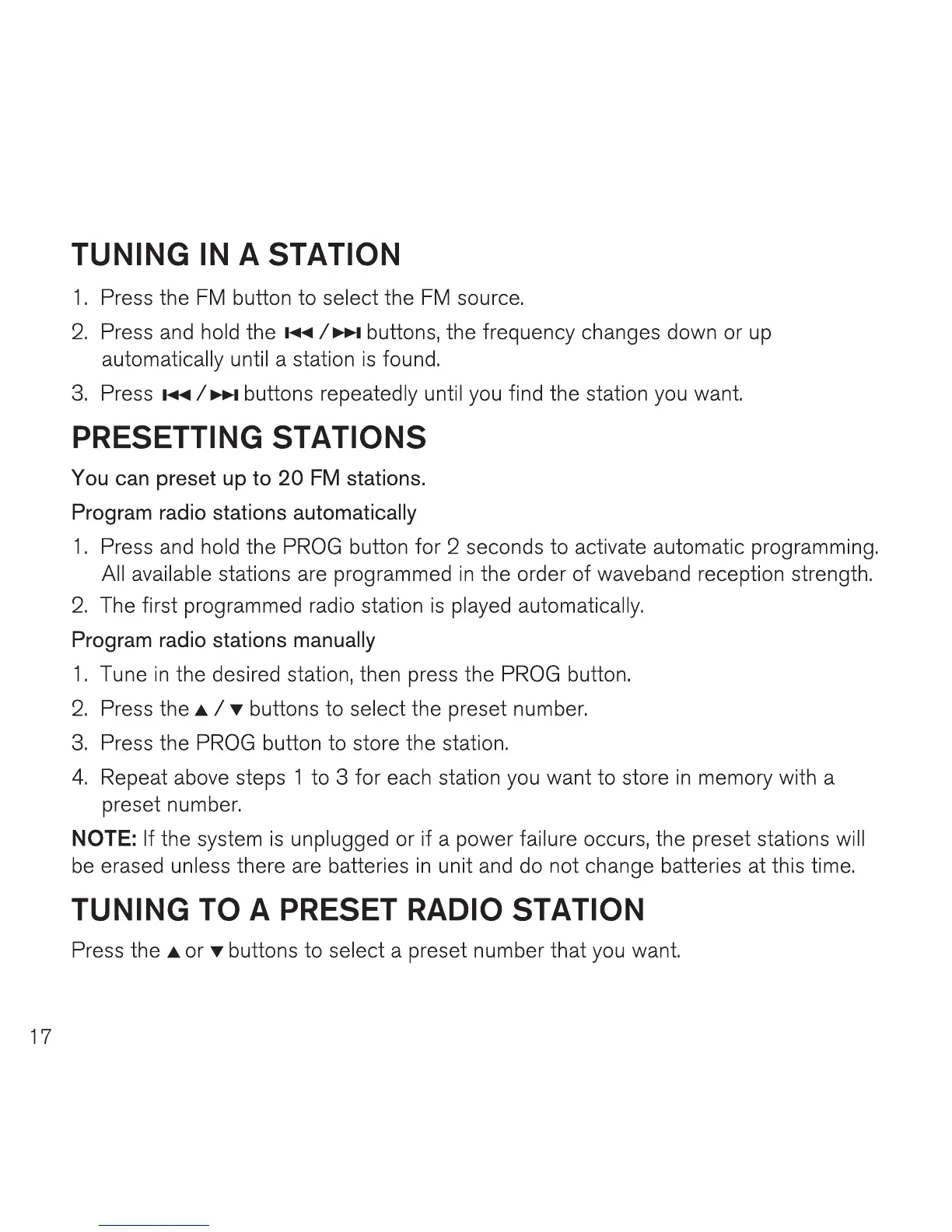Brookstone Bluetooth Clock Radio - Tuning in a Station; Presetting Stations; Tuning to a Preset Radio Station