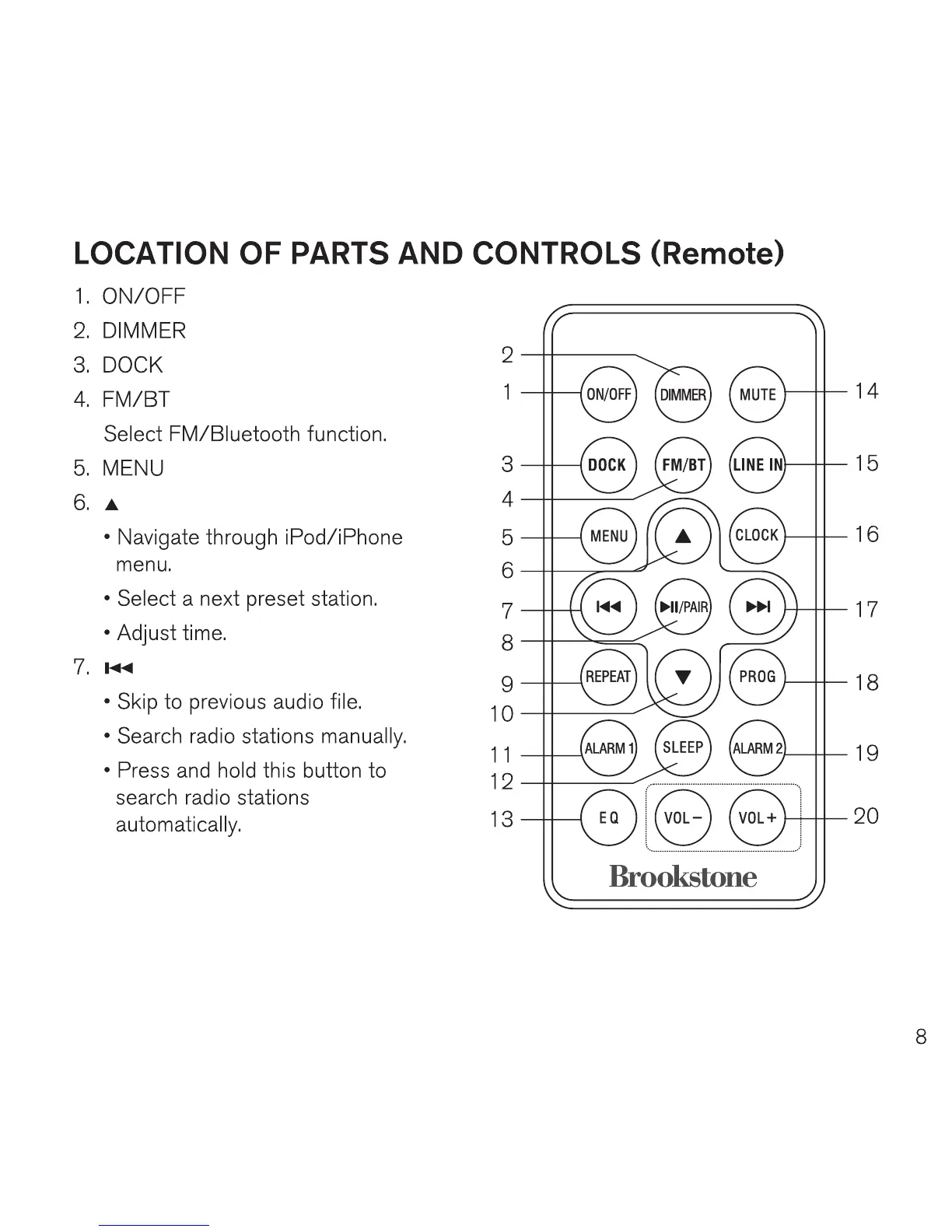 Brookstone Bluetooth Clock Radio - Location of Parts and Controls (Remote)