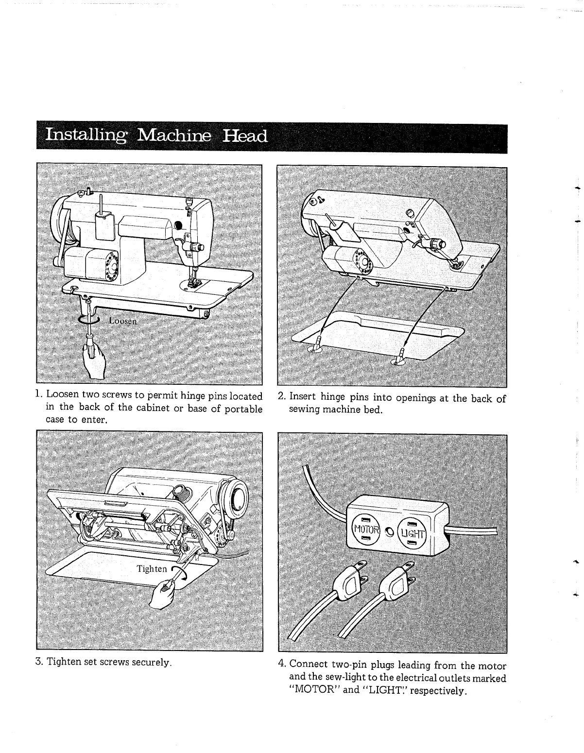 Brother 360 - Installing the Sewing Machine Head; Connecting the Machine to its Base; Connecting Power and Light Cords