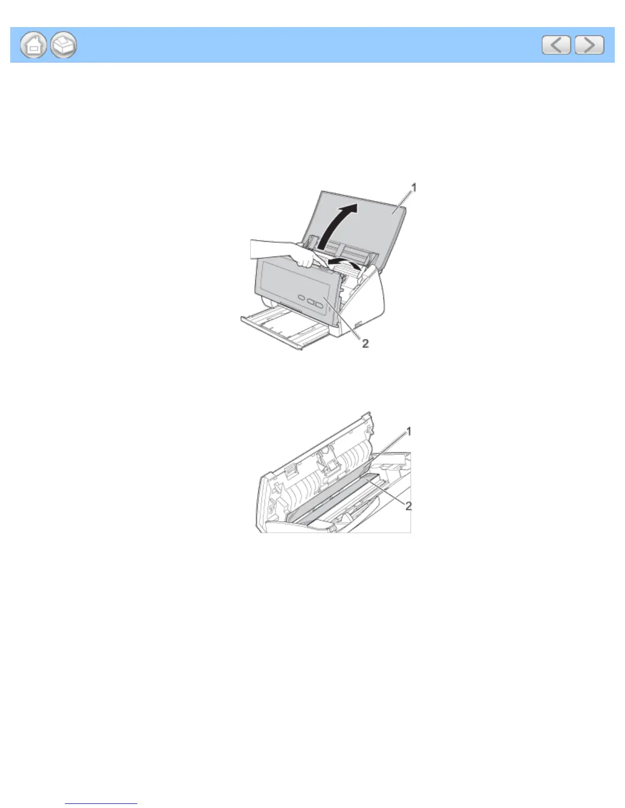 Press and hold the buttons (1) on the inside of the Front Cover and then pull the Separation Pad Cover (2)