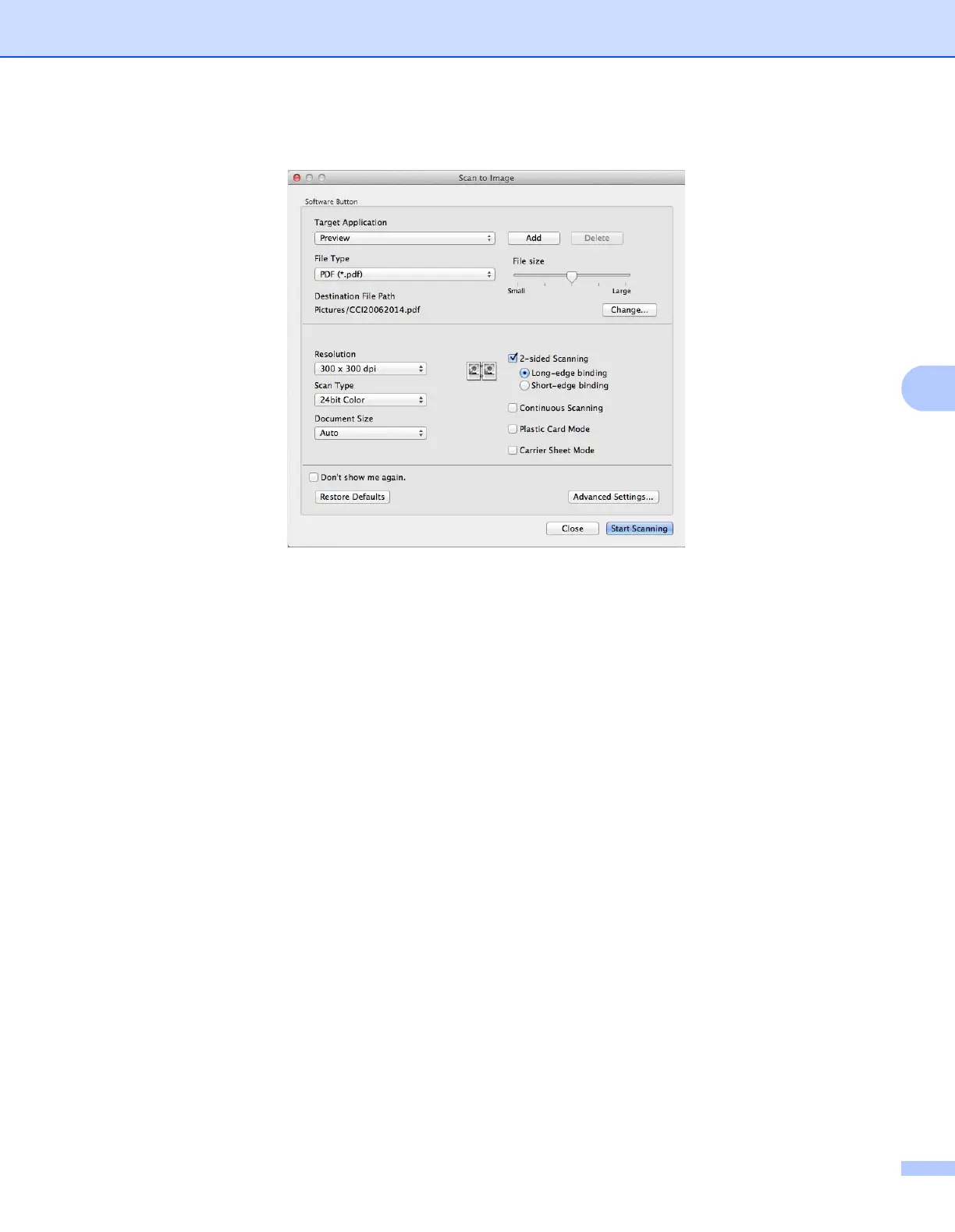 6 Change other settings if needed (see Change Scan Settings (ControlCenter2) (Macintosh) on page 89).