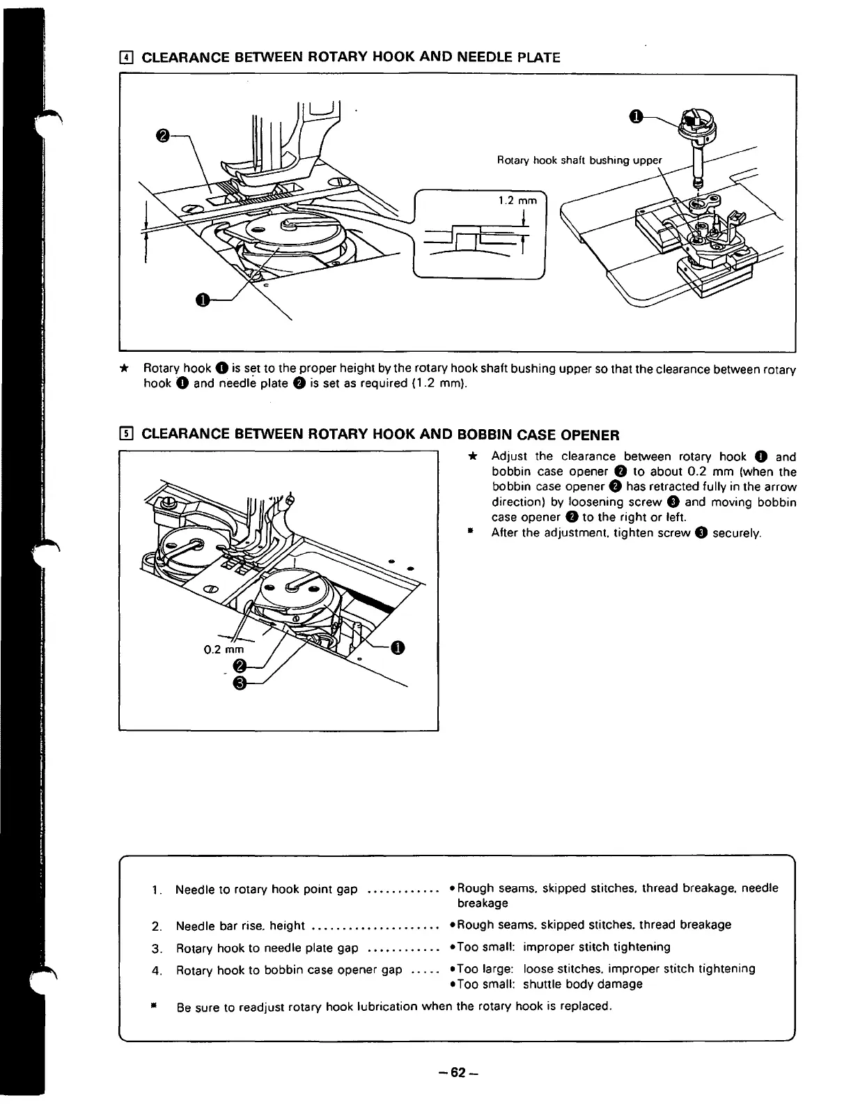 1. Needle to rotary hook point gap . • . . . . • . • . . . • Rough seams. skipped stitches. thread breakage. needle
