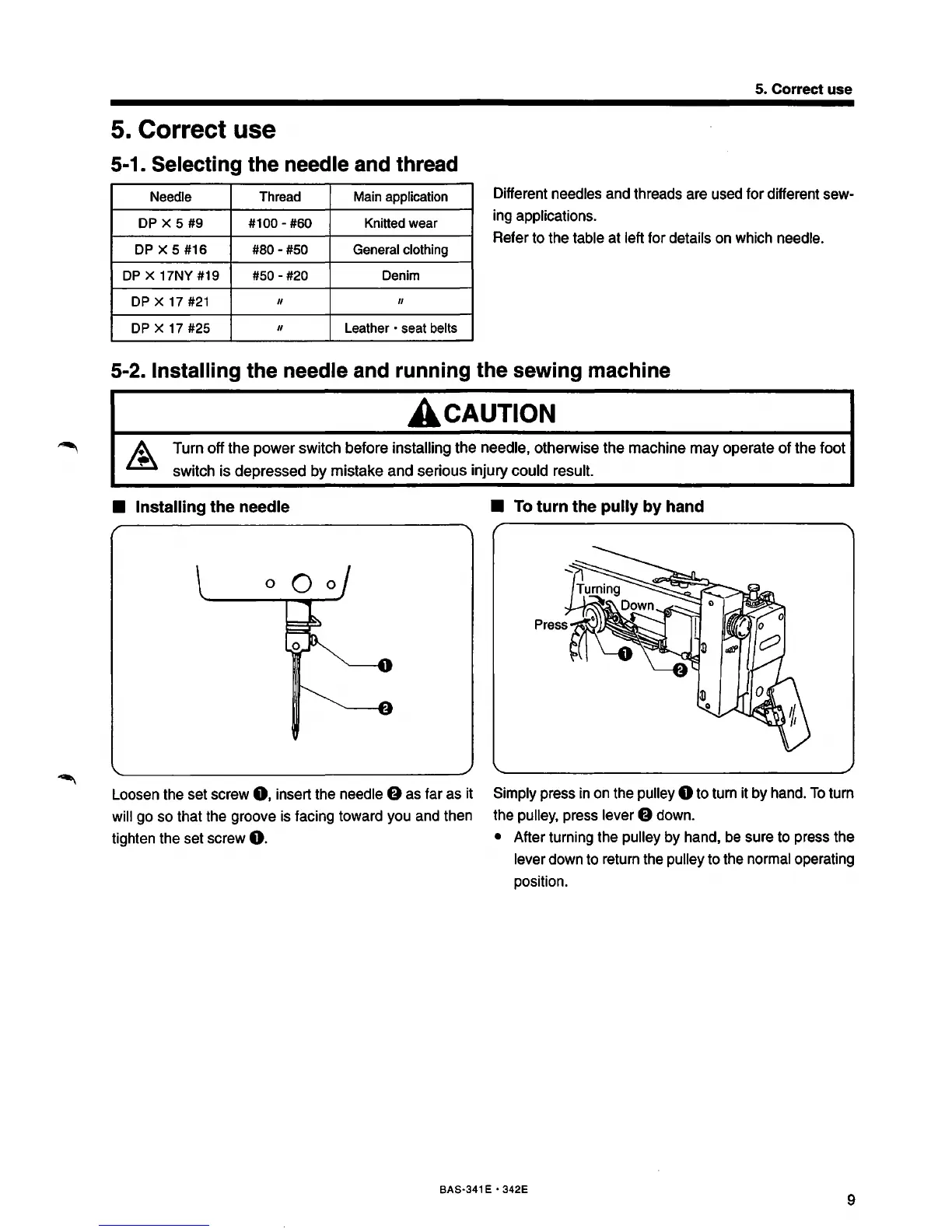 Brother BAS-341E - 5 Correct Use; Selecting the Needle and Thread; Installing the Needle and Running the Sewing Machine