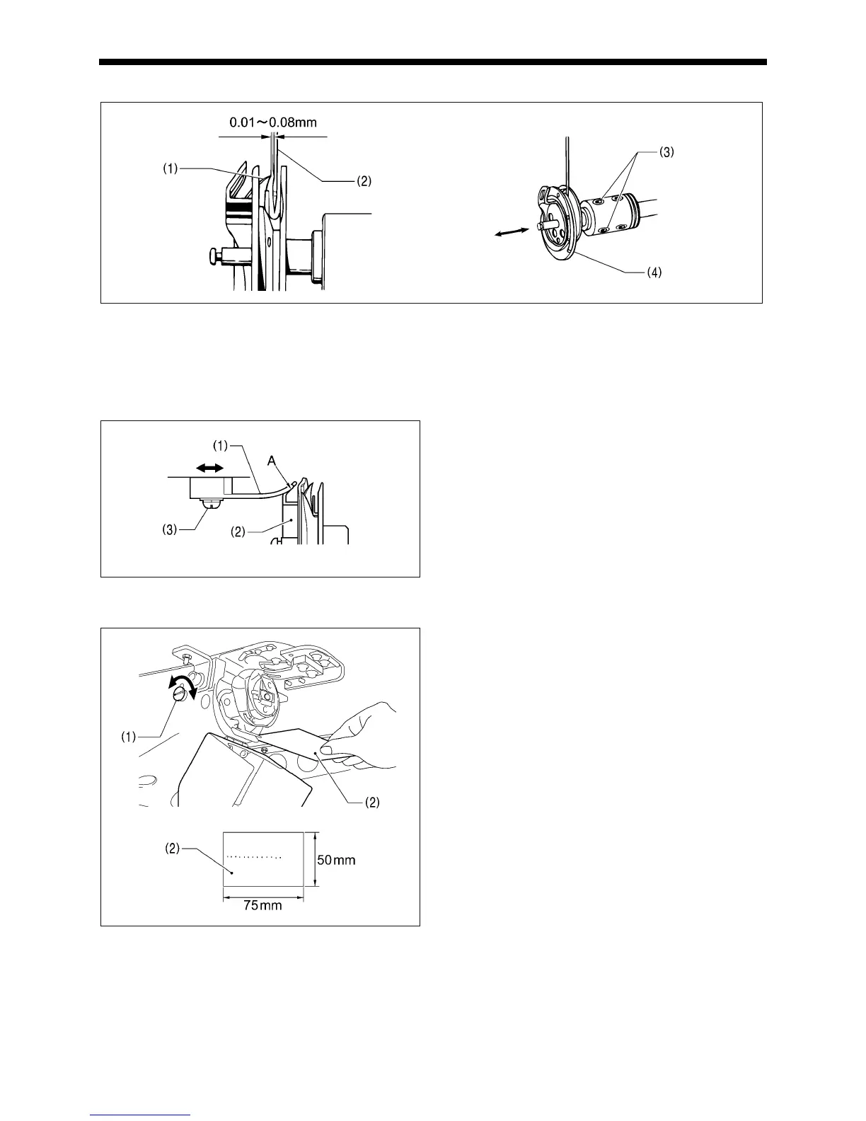 (3) and move the rotary hook (4) forward or back to adjust so that the clearance between the needle (2) and the rotary hook