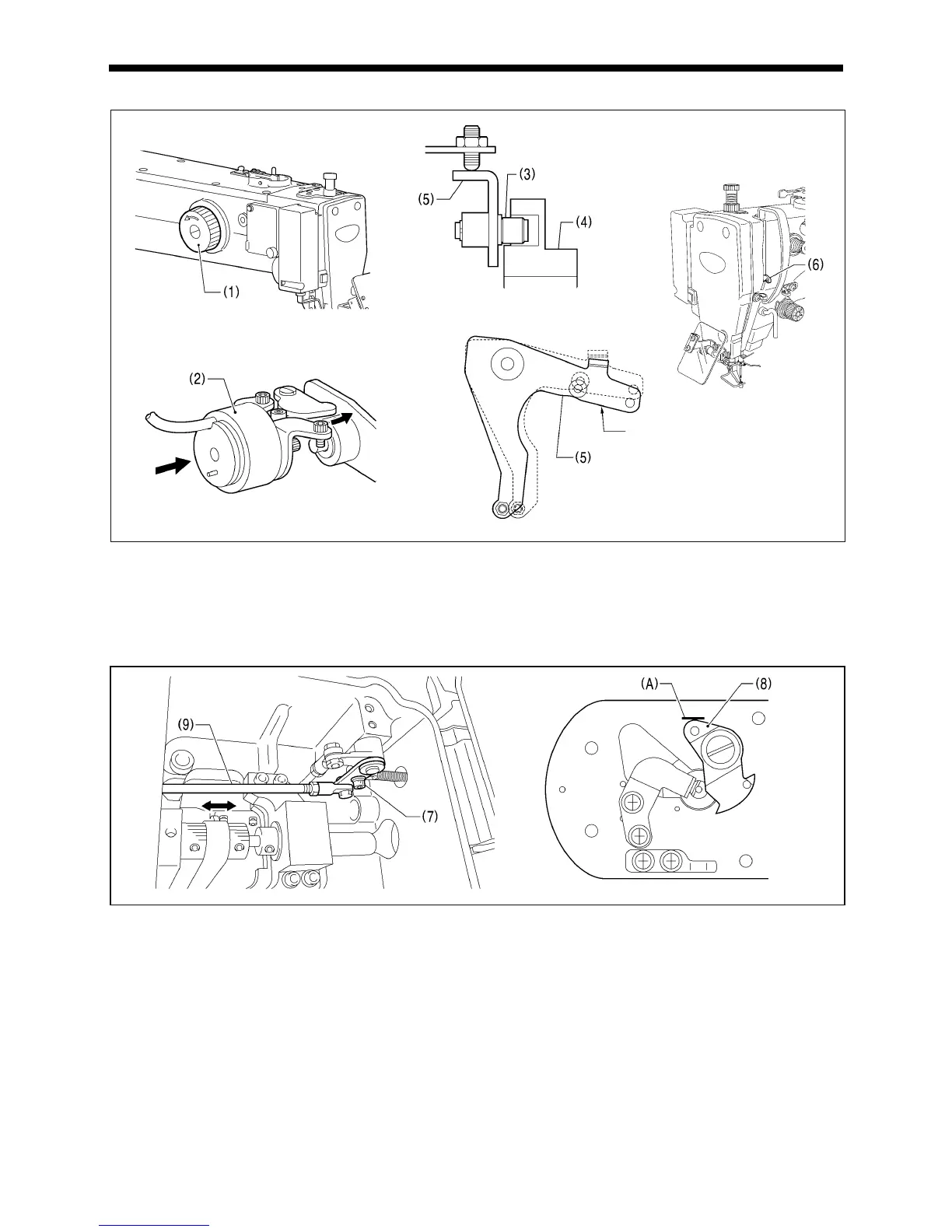 5. Move the thread trimming rod H (9) forward or back to adjust so that the ridge line on the movable knife (8) and reference