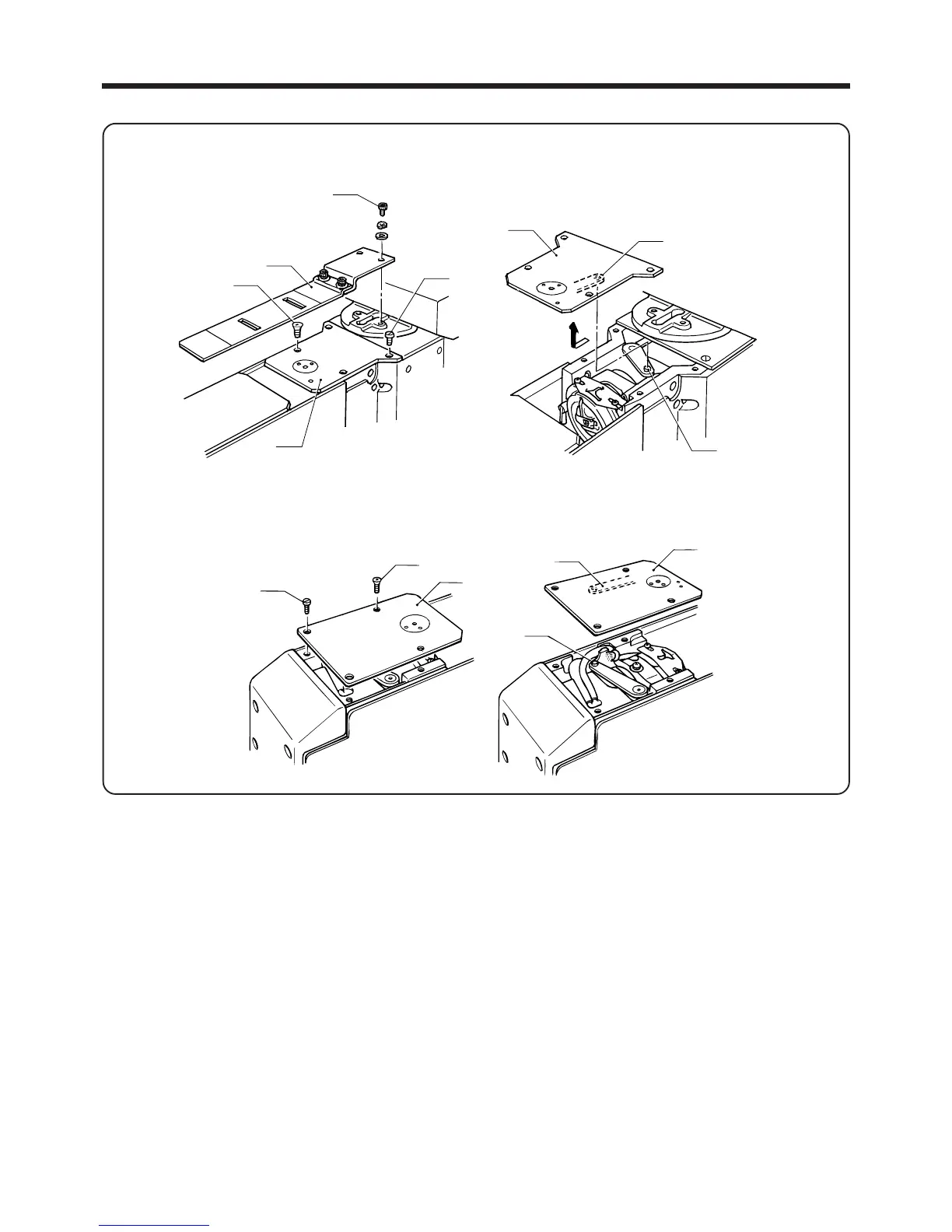 1. Open the large shuttle hook cover, remove the screw q, and then remove the feed plate w.