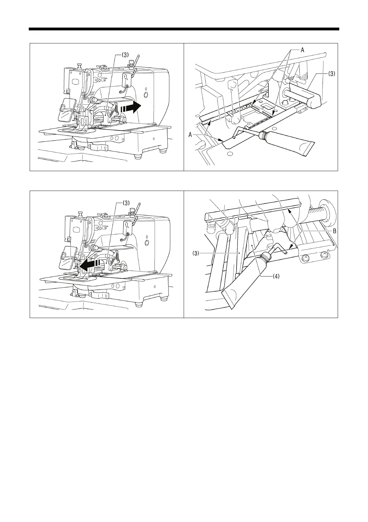 Push the work clamp arm (3) all the way to the front edge, lift up the bellows (4), and then apply grease to groove B.