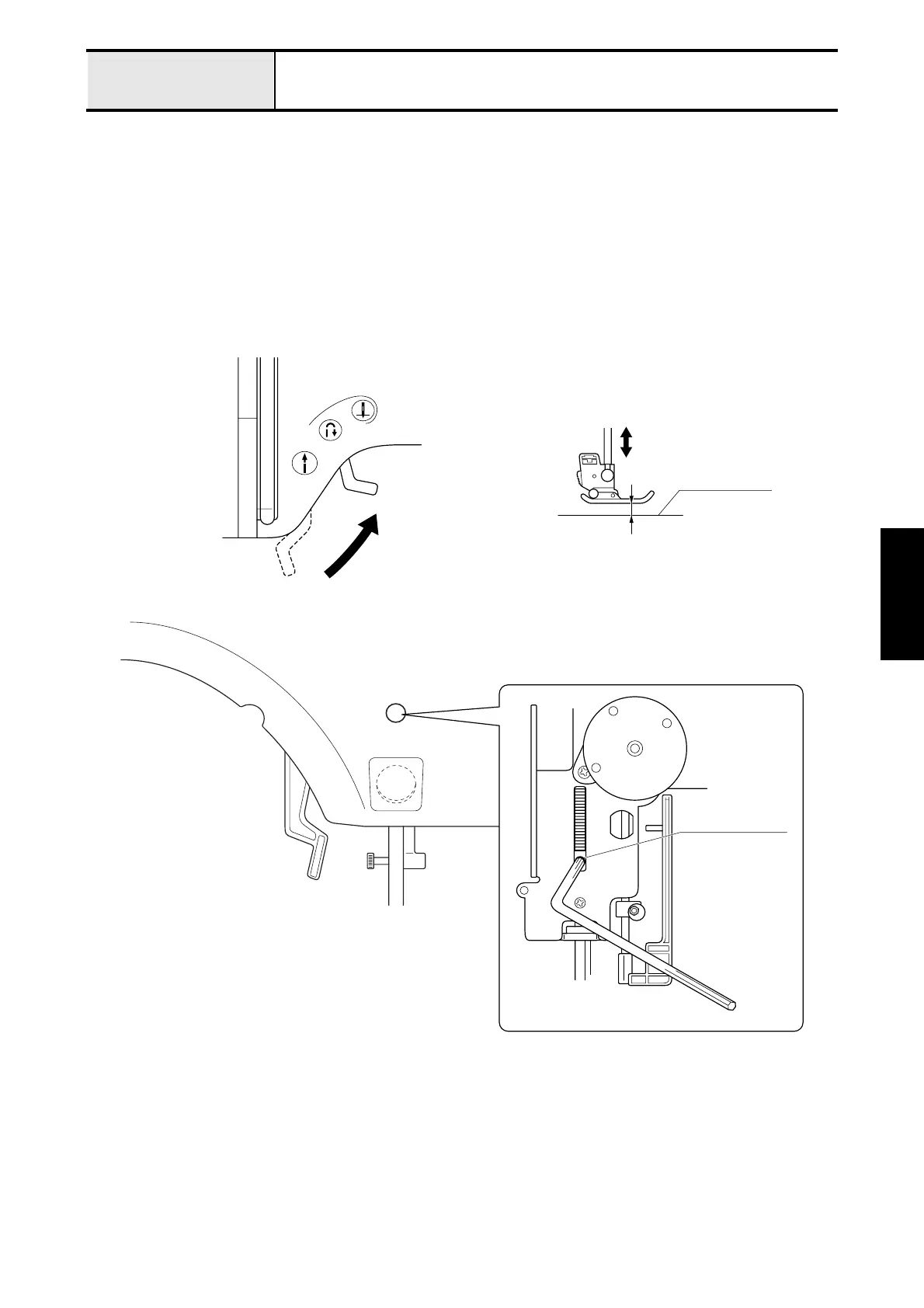 • Adjust the presser bar so that the needle plate feed dog hole and the presser are parallel (to prevent slanting